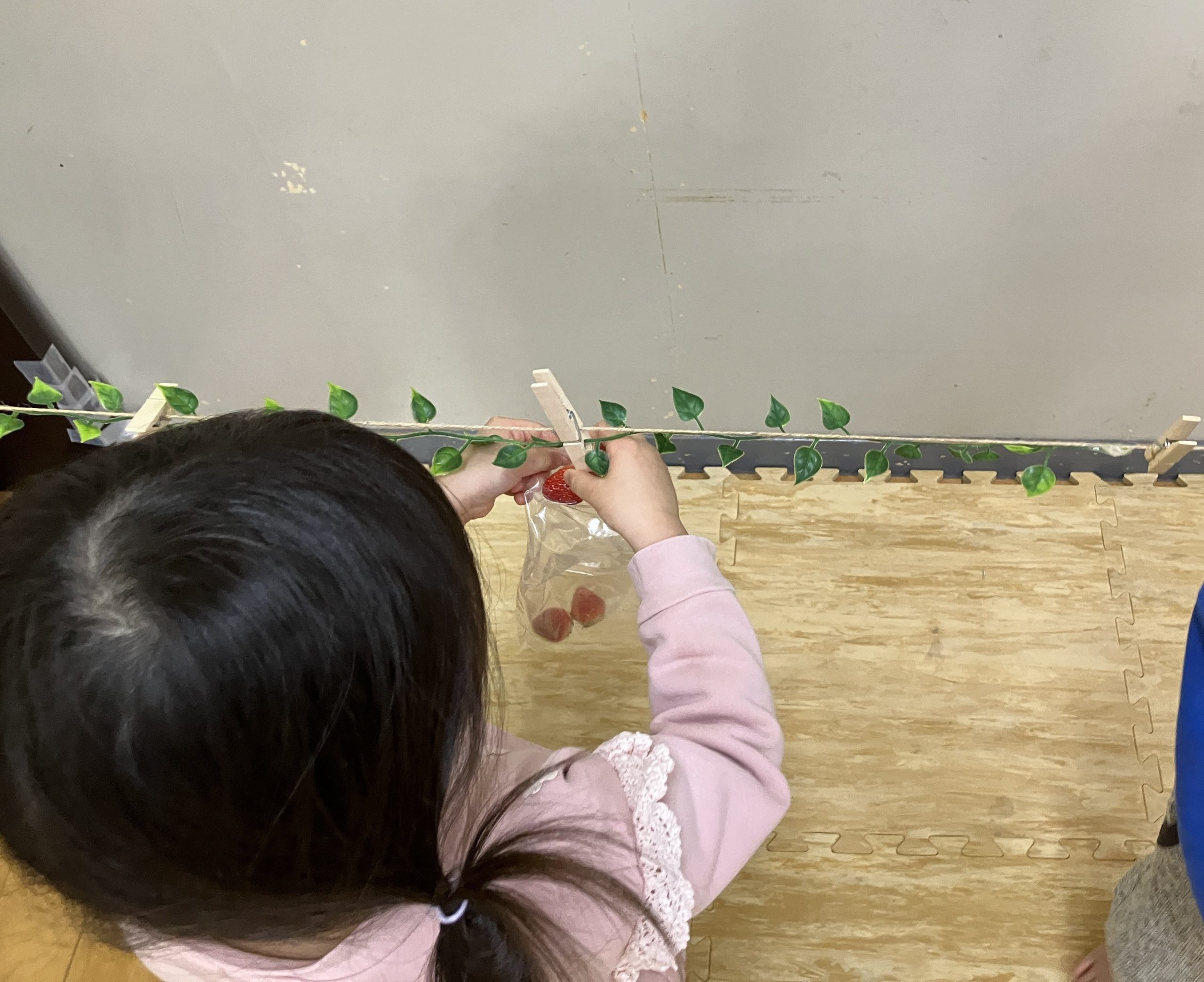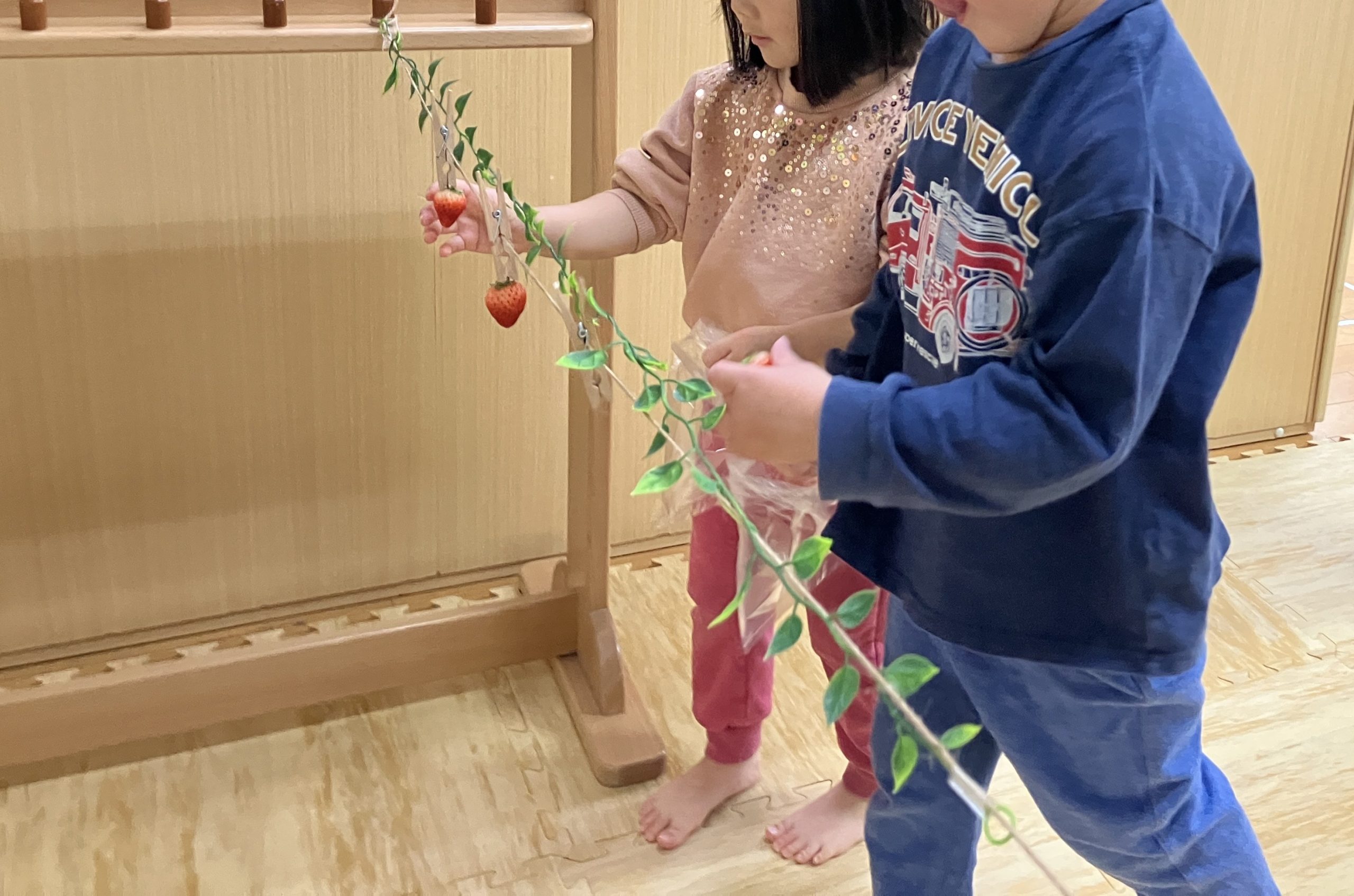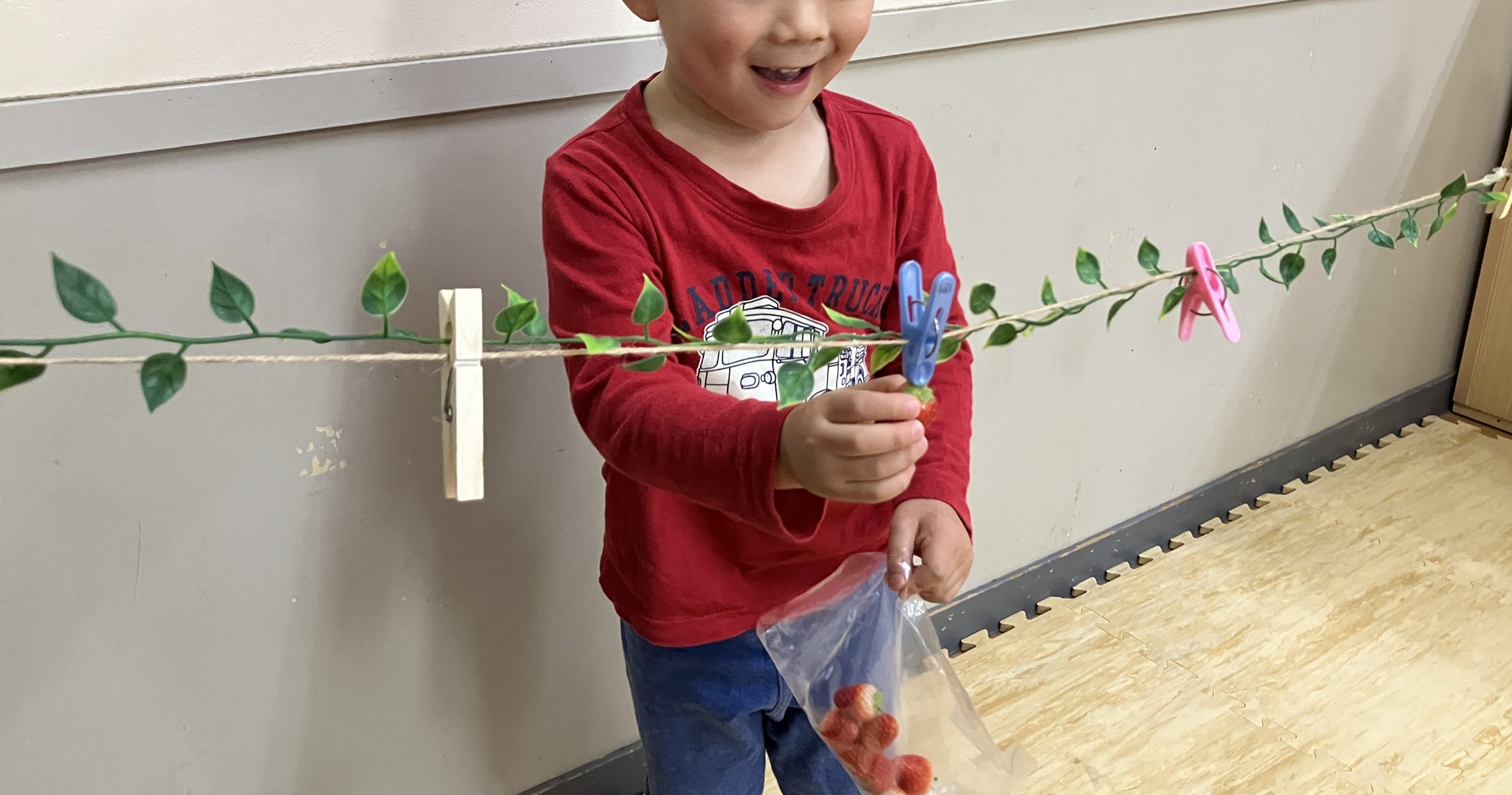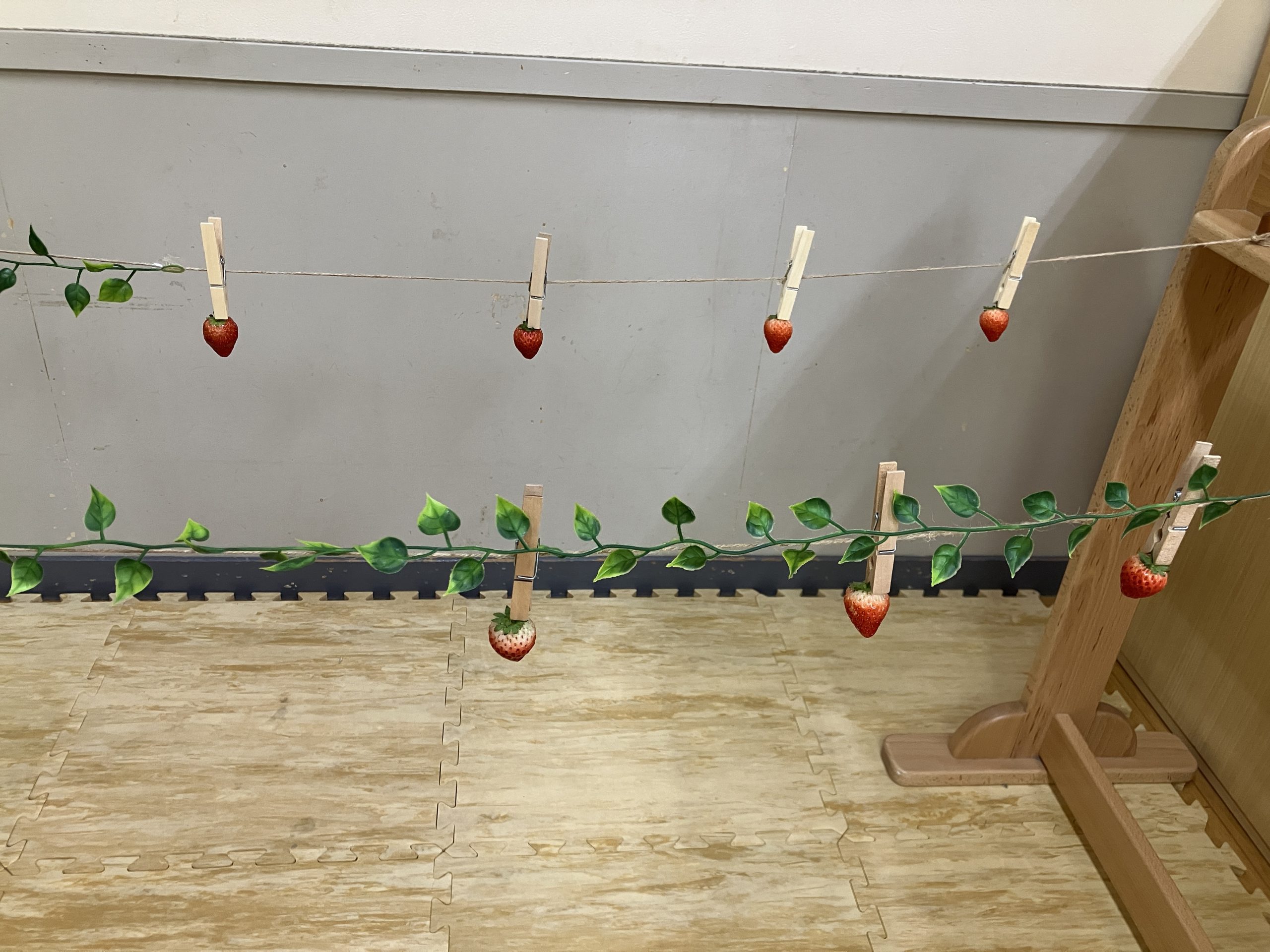 クリップでヘタを挟んで、いちご狩りの会場を作りました。
