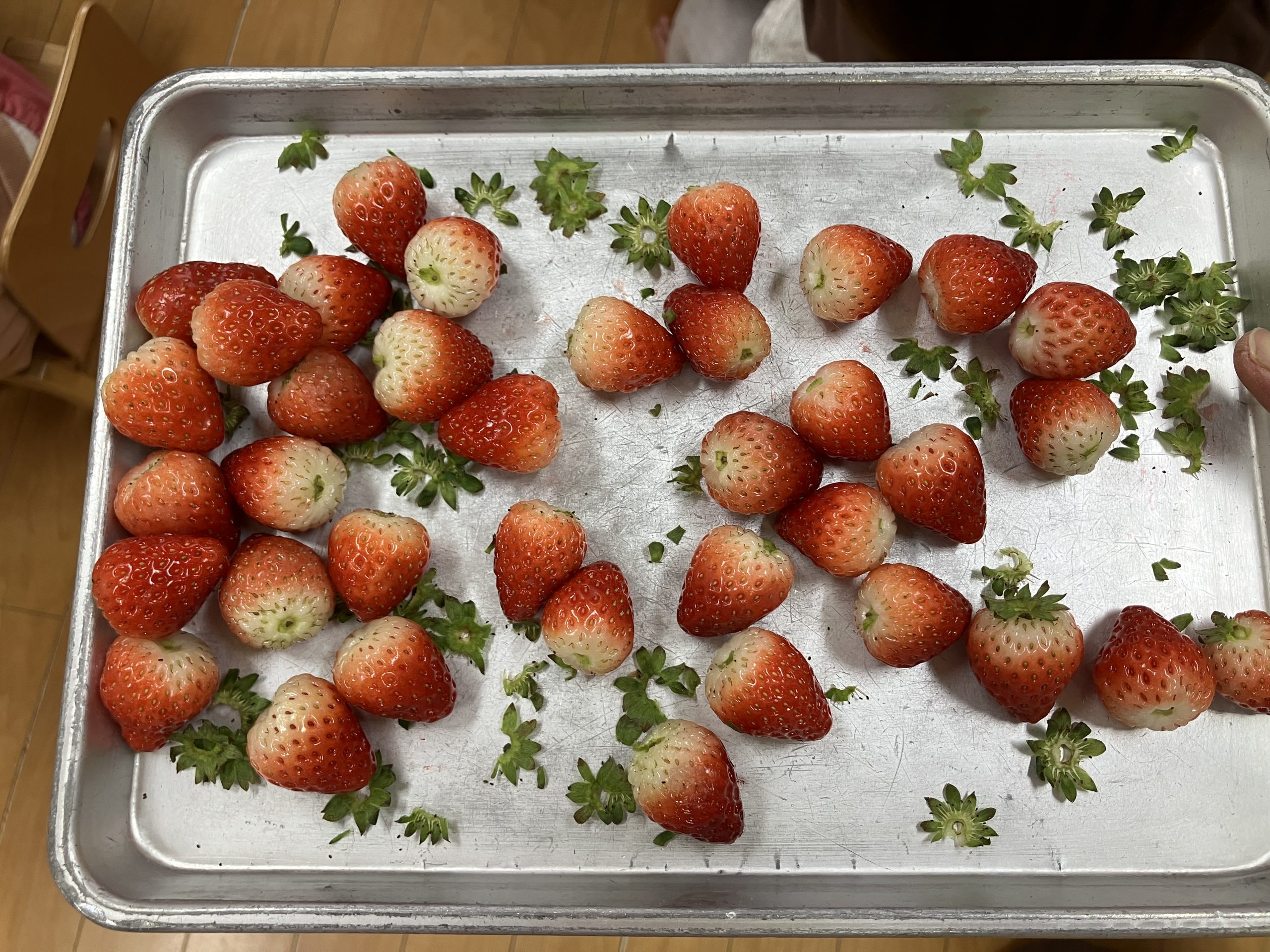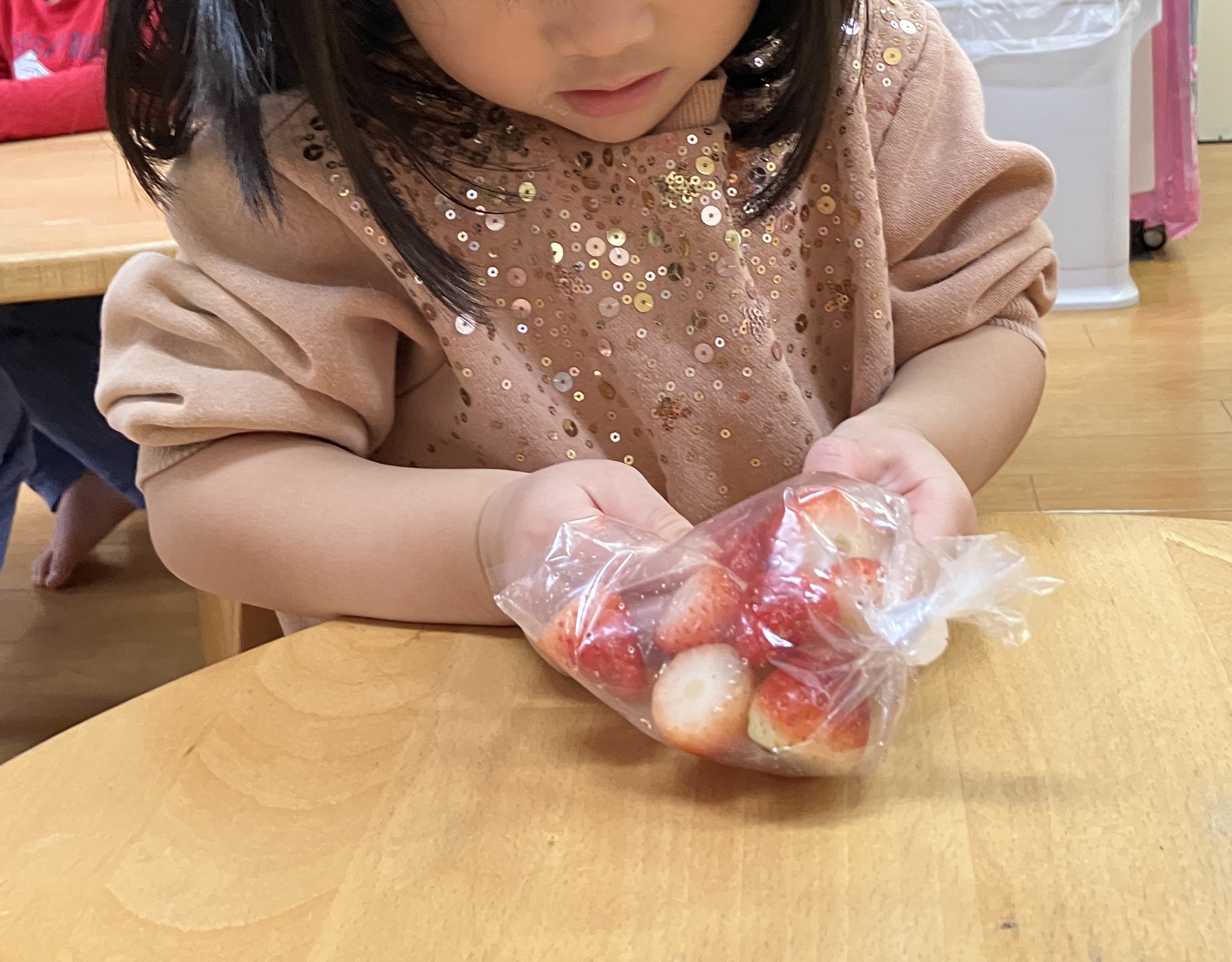 いちごのヘタも取ってもらおうかな?と話すと「やる!!」とりんごさんたち。