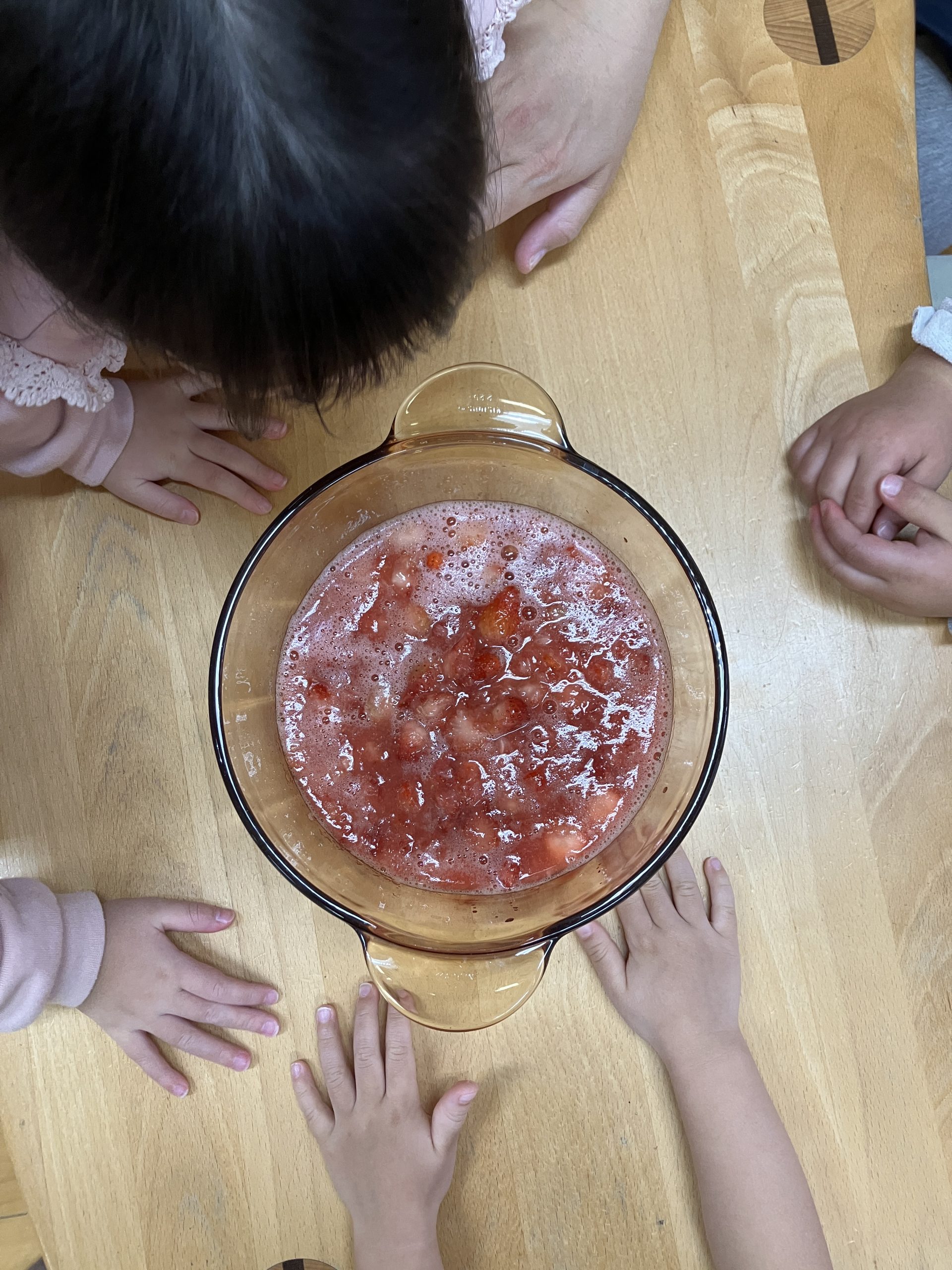 りんご組さん(2歳児クラス)でいちごジャム作りをしました。