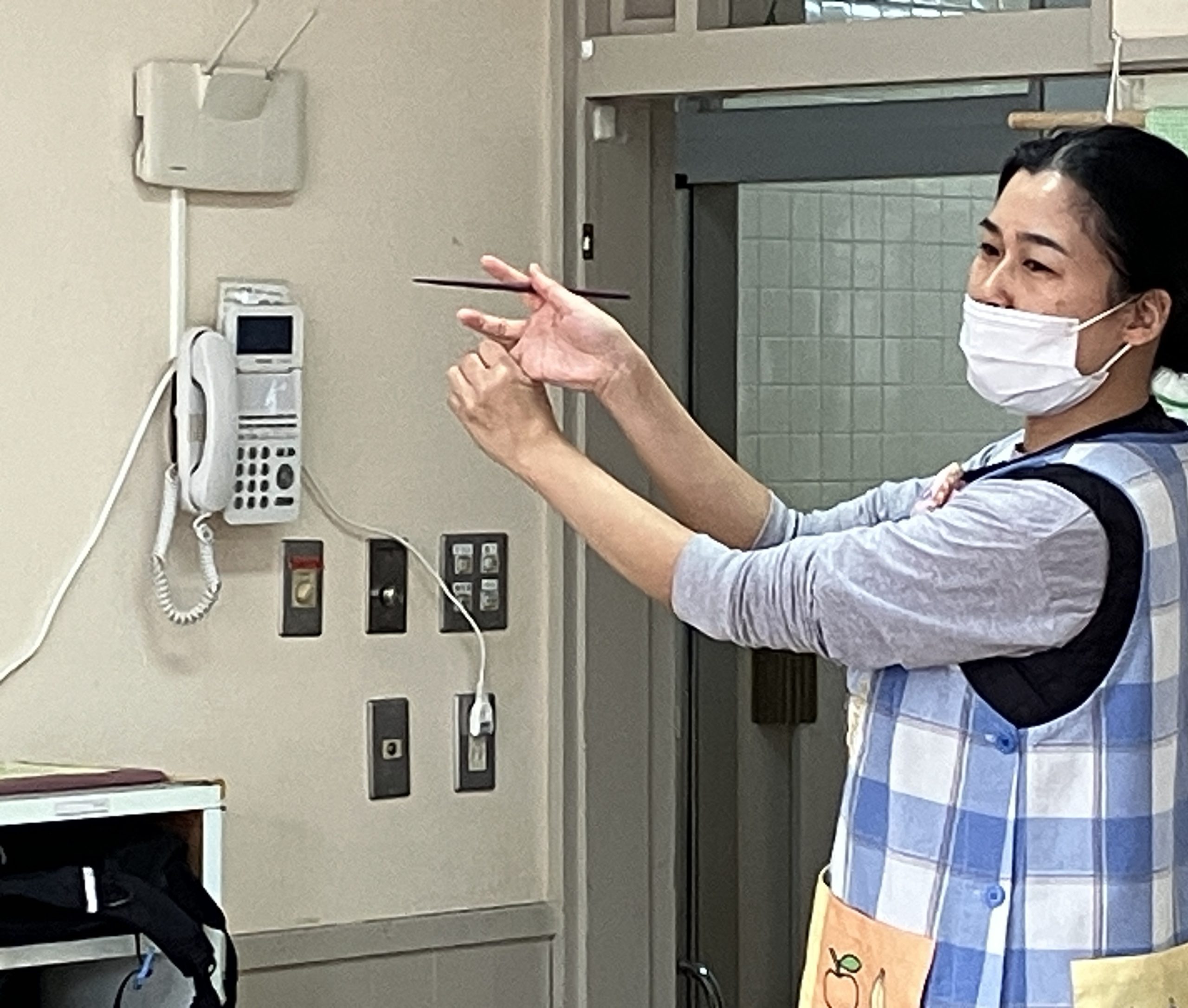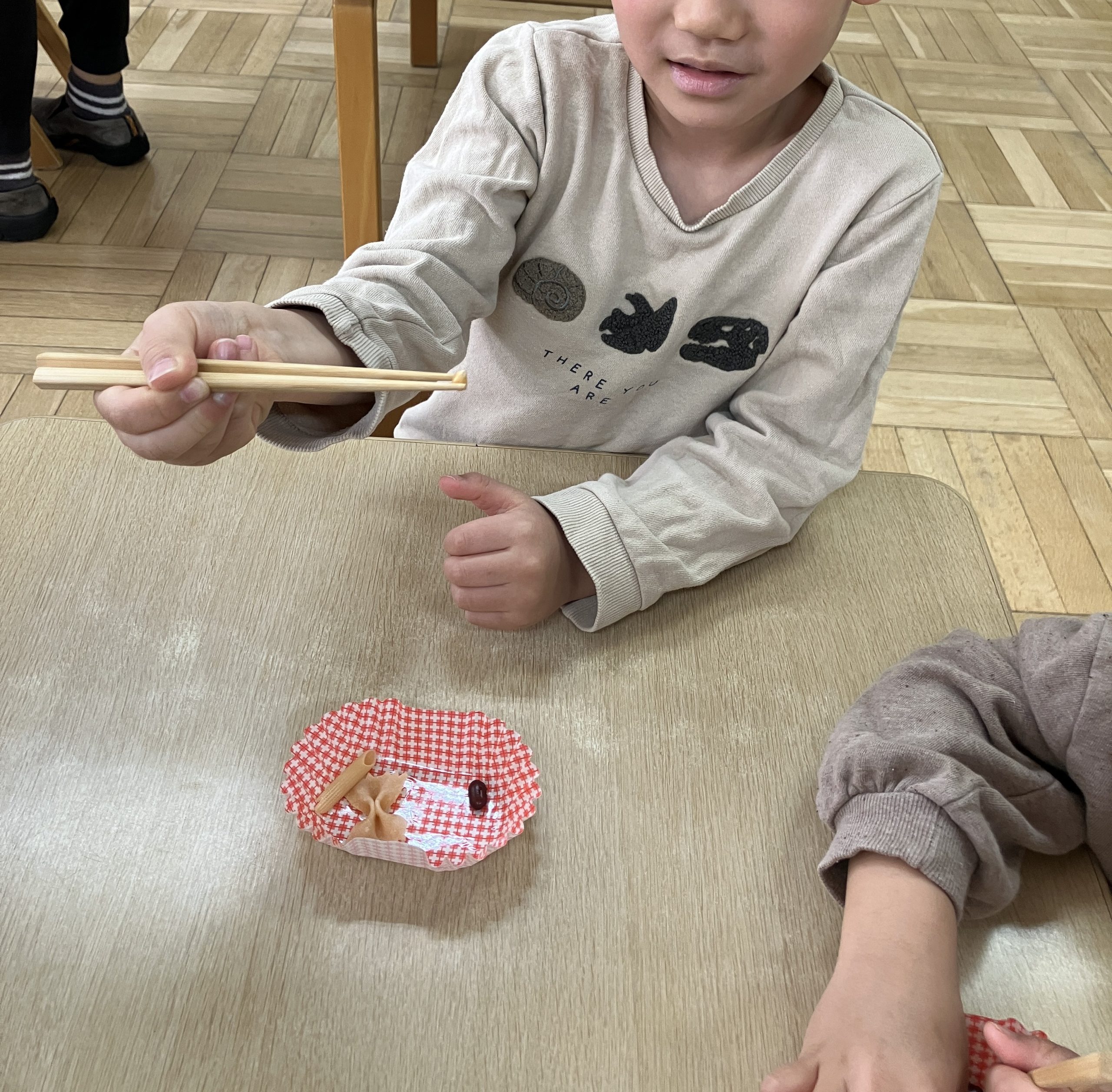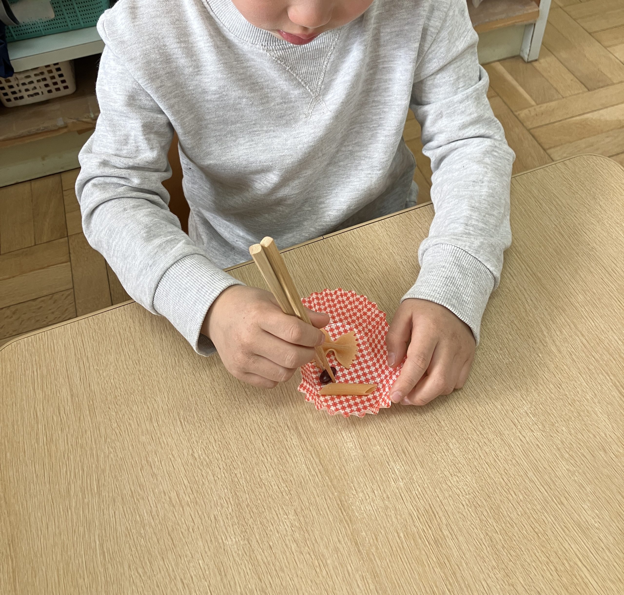 栄養士がお箸の持ち方の説明をしてから練習スタート!