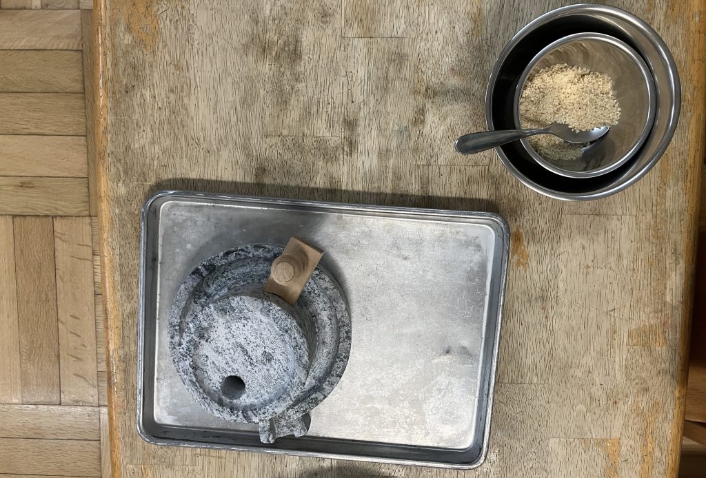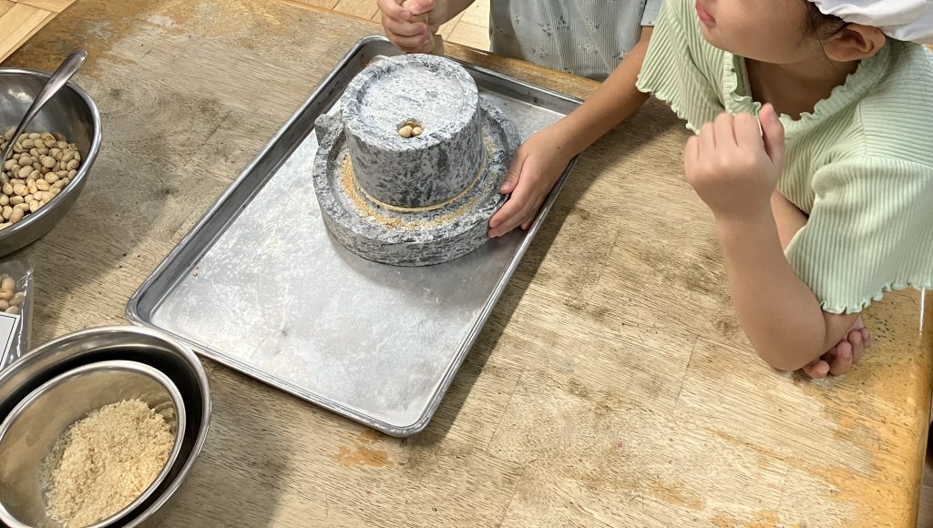 ゴリゴリっと石臼を回していくと、大豆がプチプチ潰れる音が聞こえます…