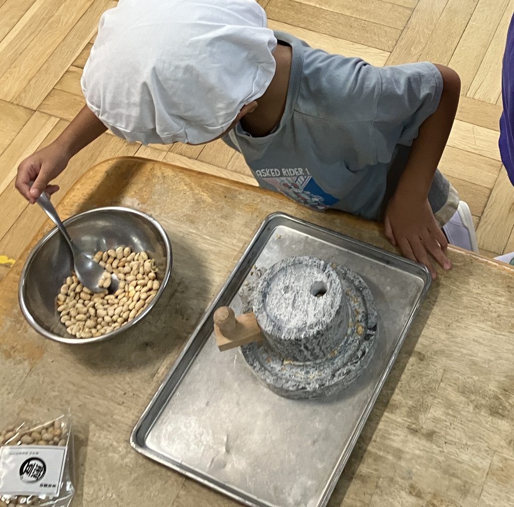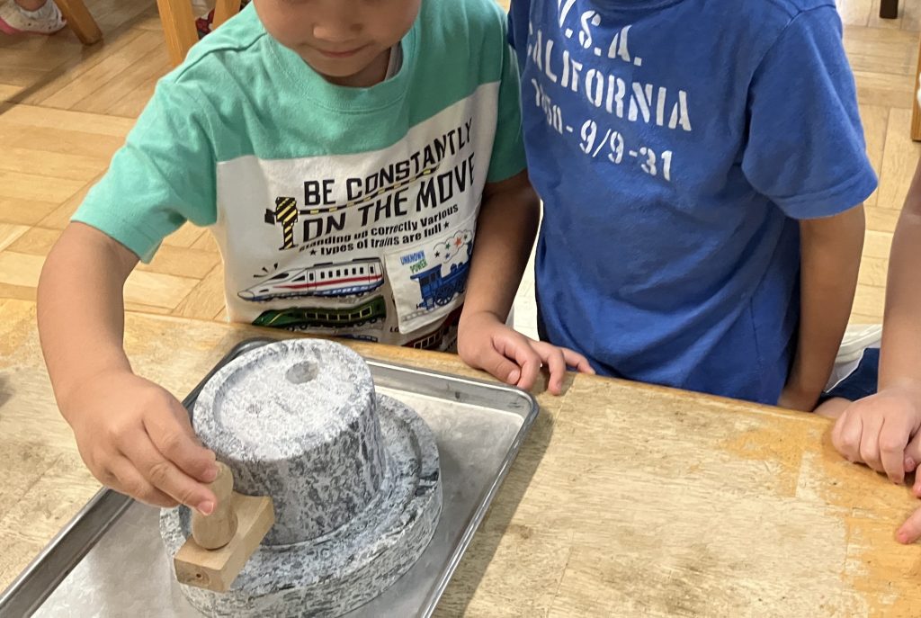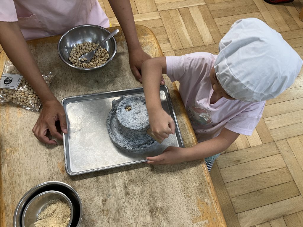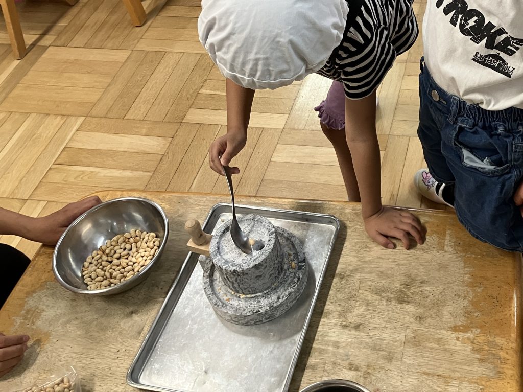 すいか組さん(5歳児クラス)できな粉作りとおはぎ作りを行いました。