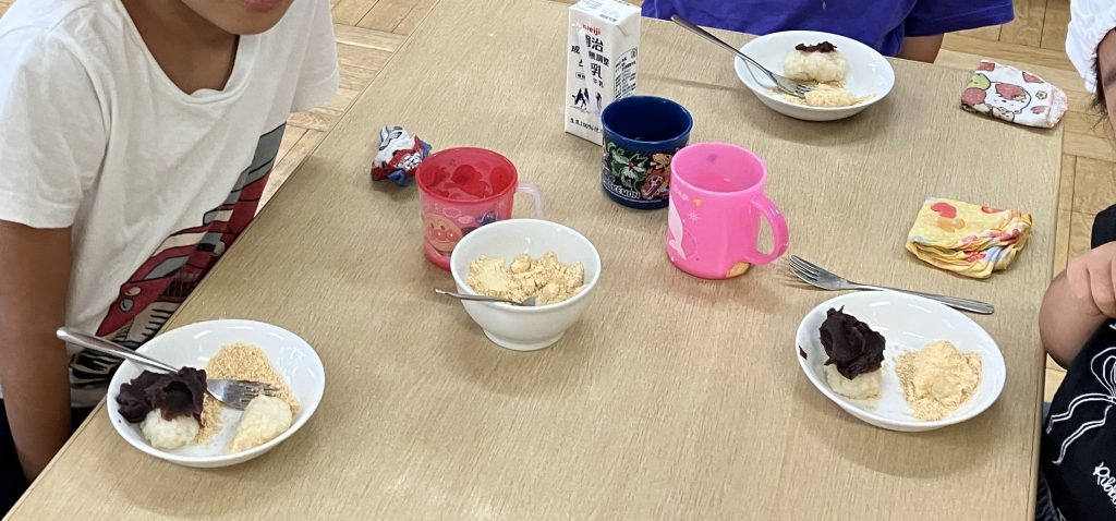お彼岸のお話、秋分の日のお話、どうしておはぎを食べるの?のお話をしたあと、あんこときな粉の2色おはぎを作りました。