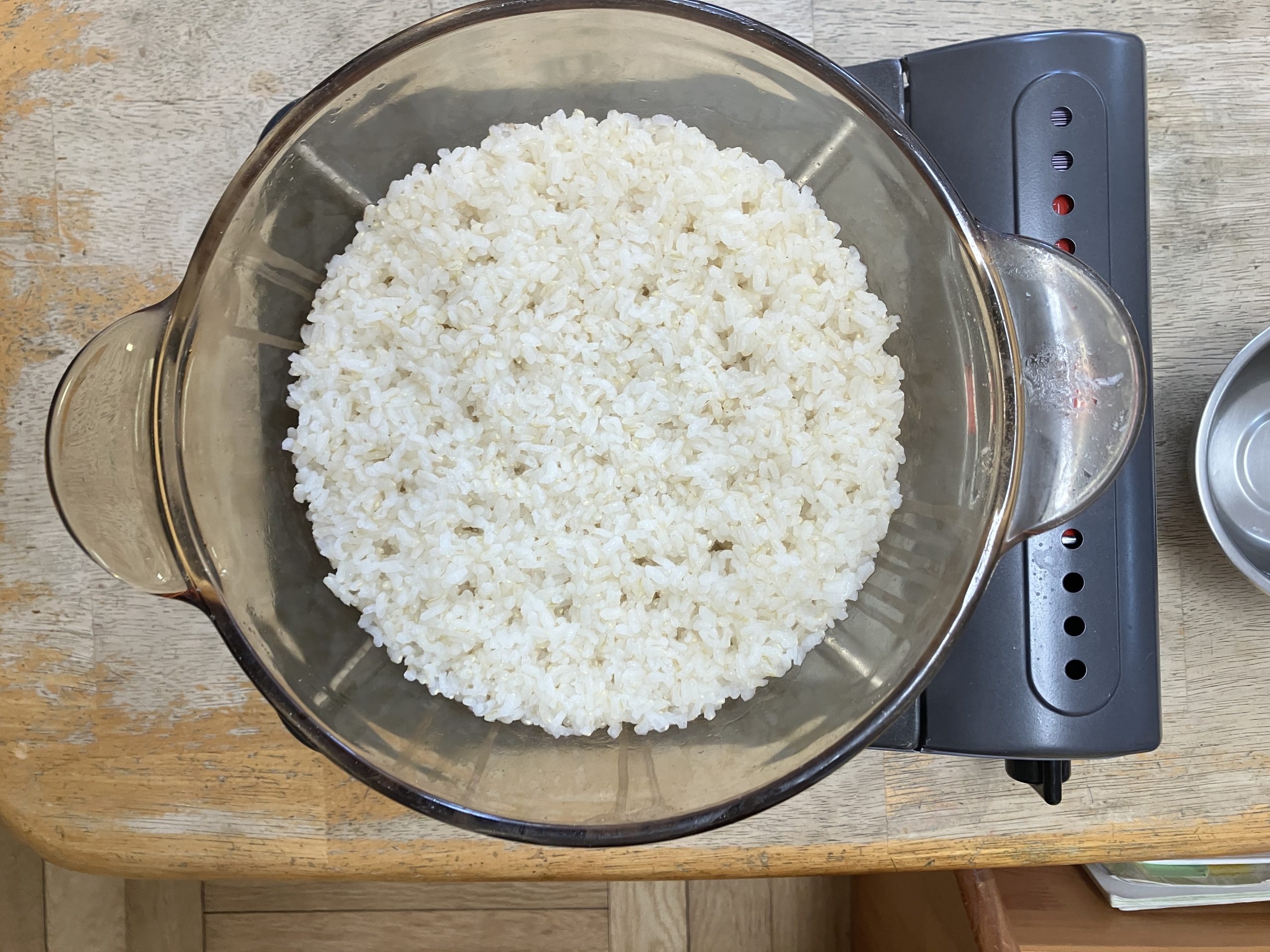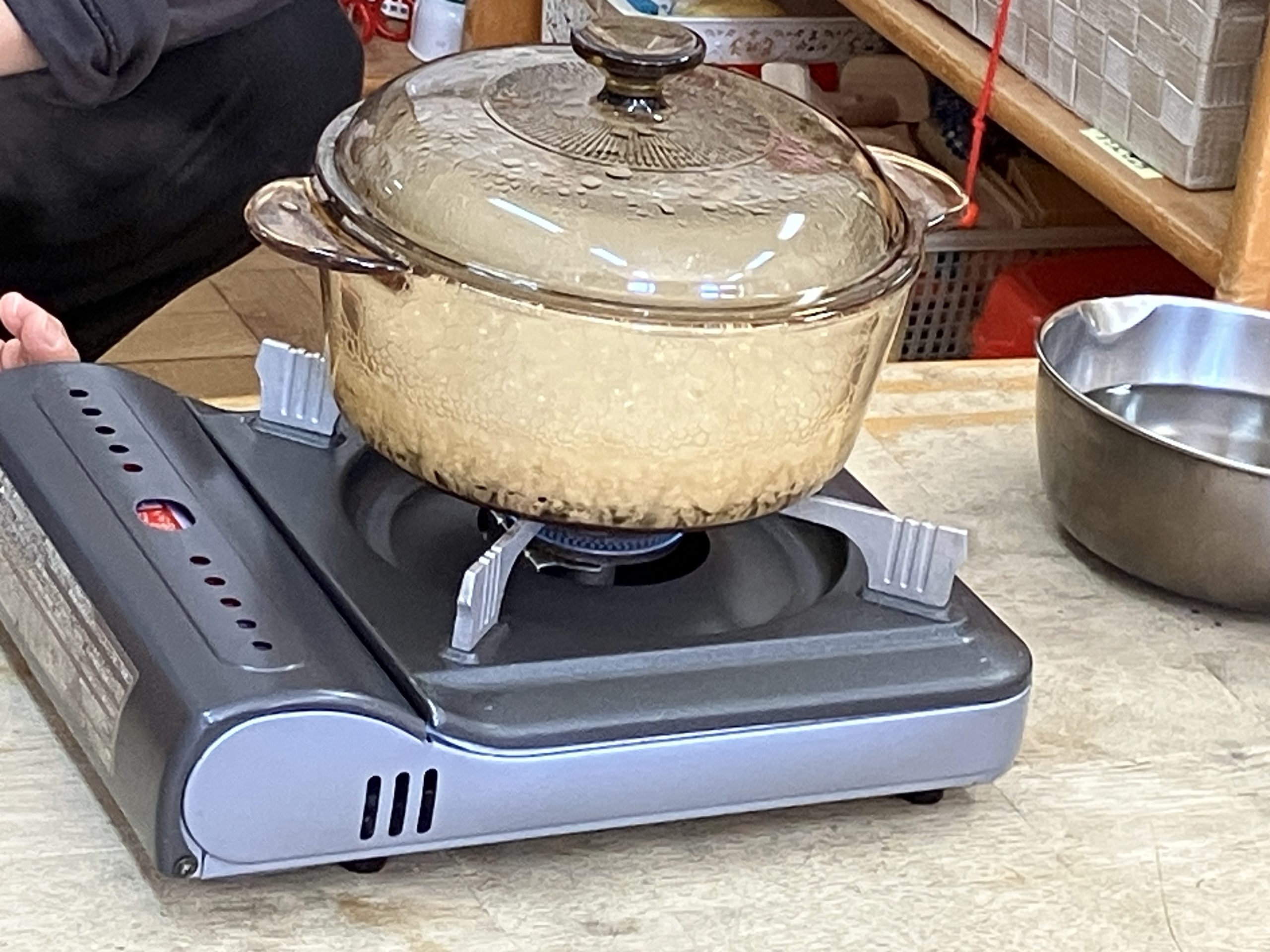 中身が見える鍋でご飯が炊ける様子を観察します。
