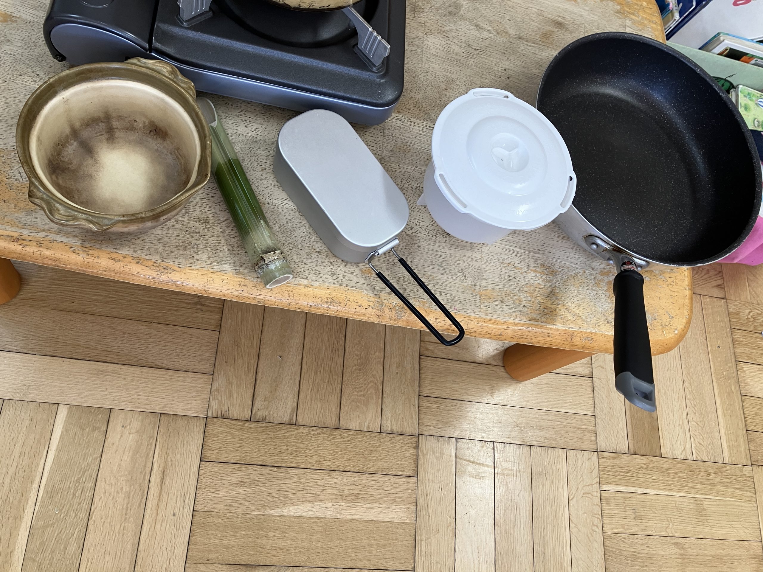 土鍋・竹・メスティン・プラスチック容器・フライパンの5種類の中でご飯が炊ける道具は何個あるかな?