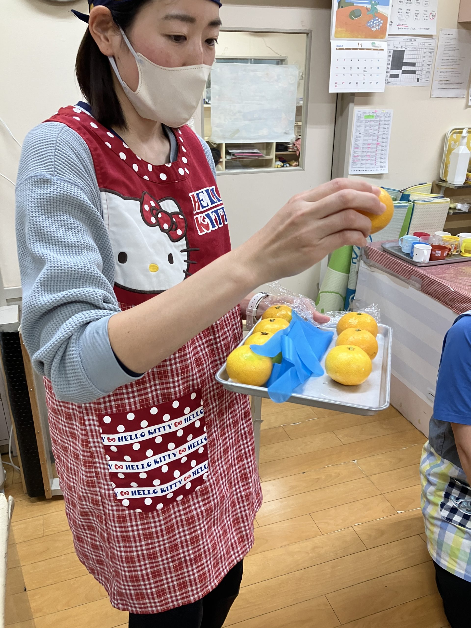 今日は皮付きのみかんをひとり1個提供し、みかんの皮むきチャレンジしてみました!