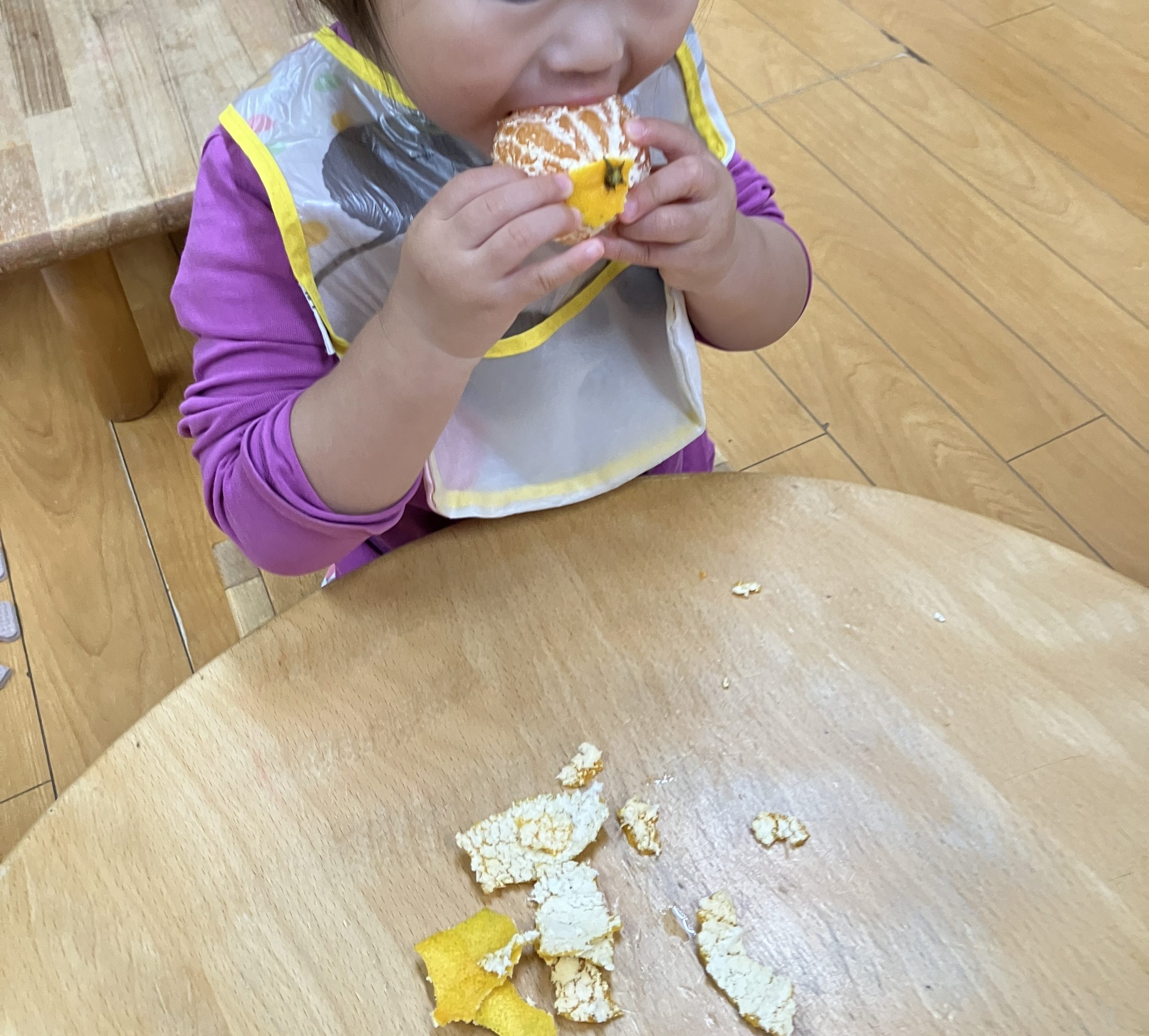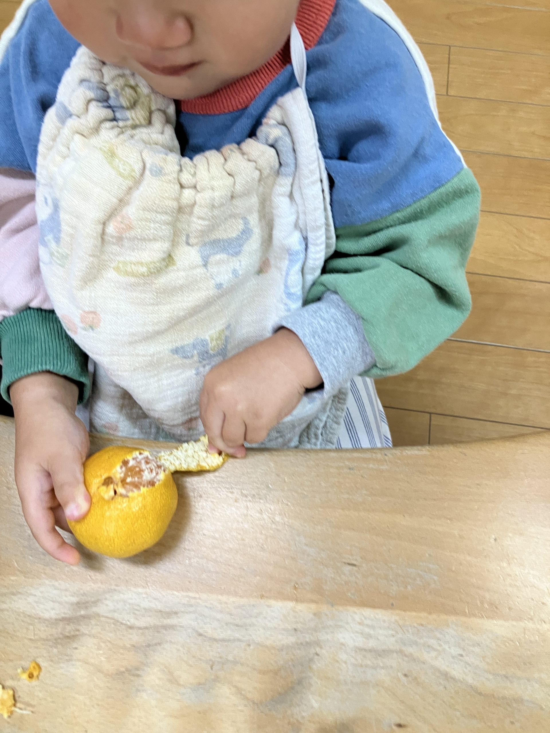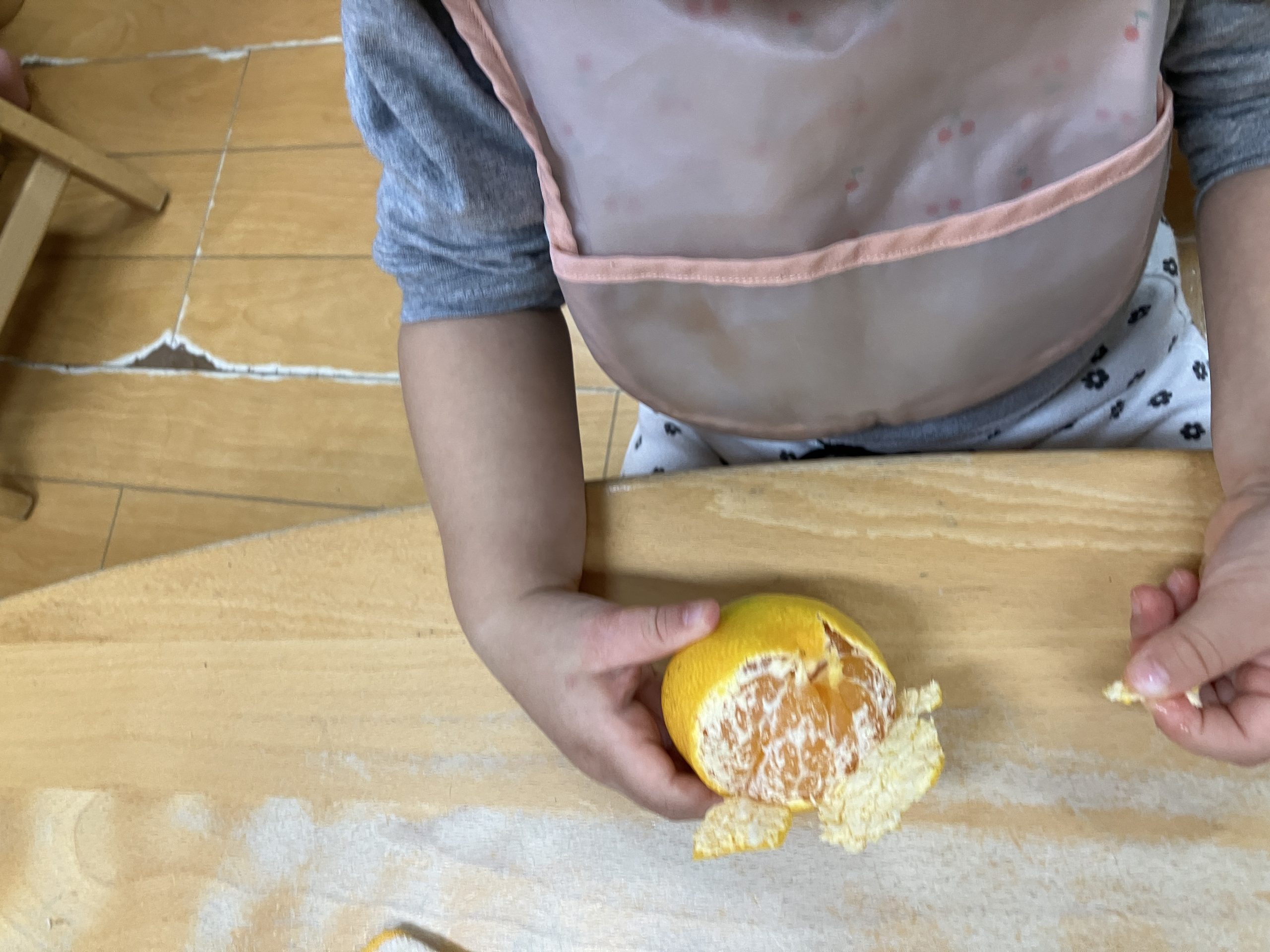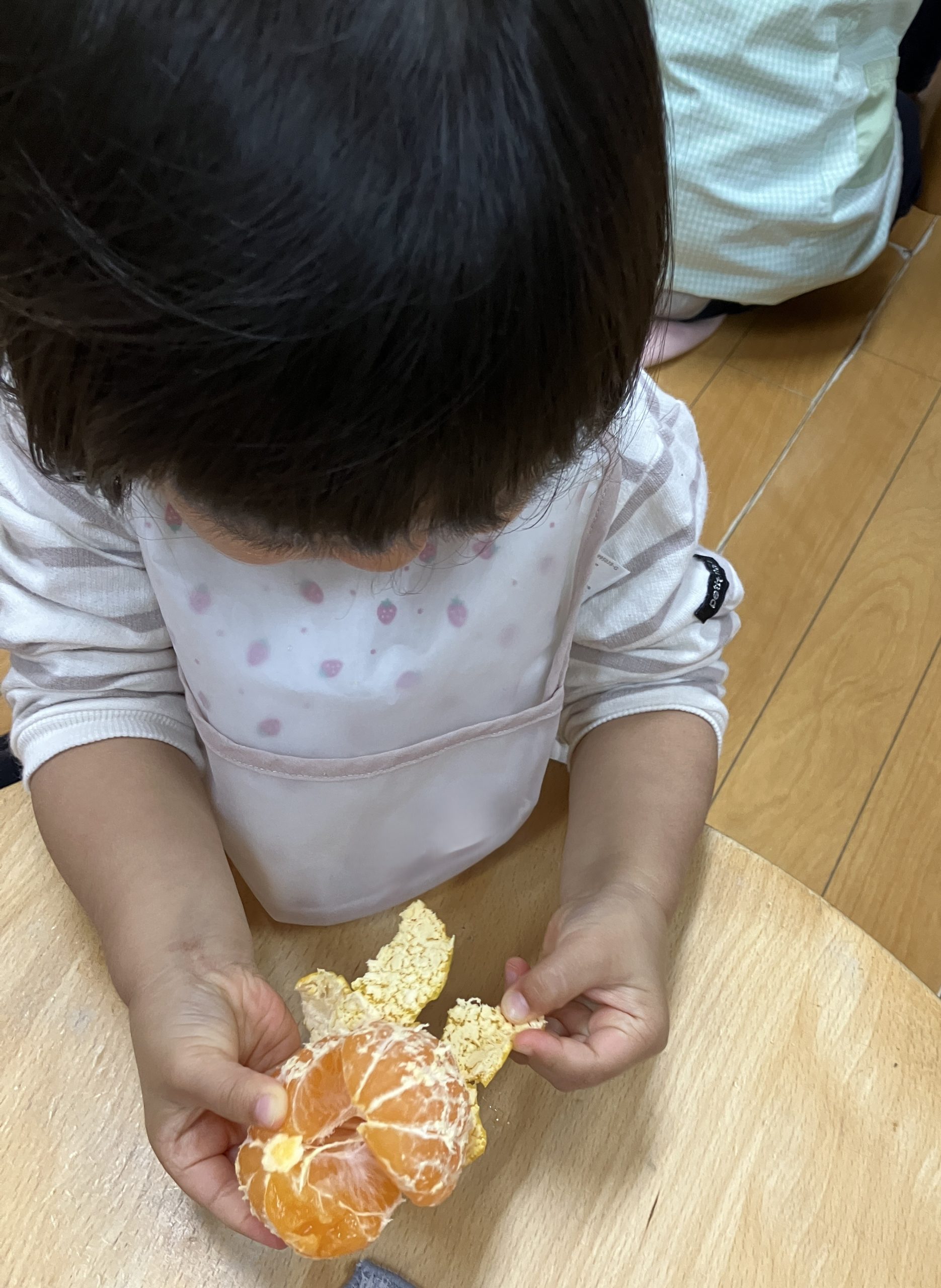 みかん組(1歳児クラス)さん、いつもは給食室でみかんの皮を剥いてから提供していますが…