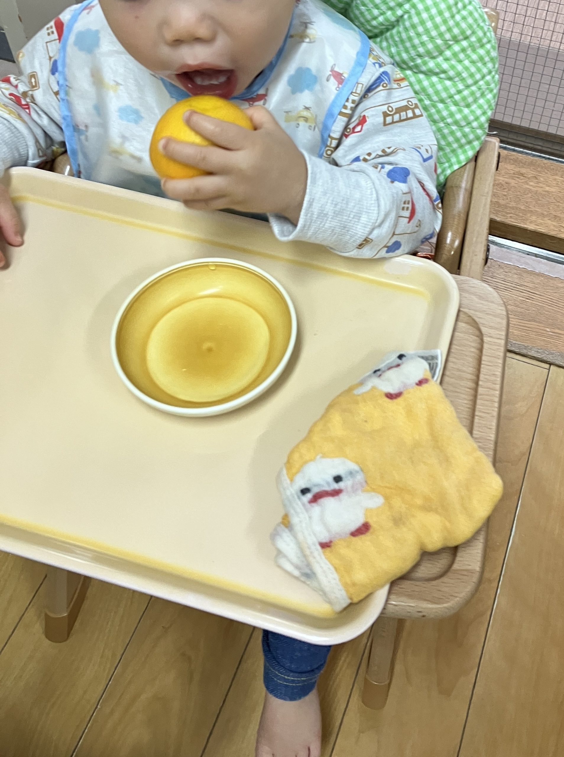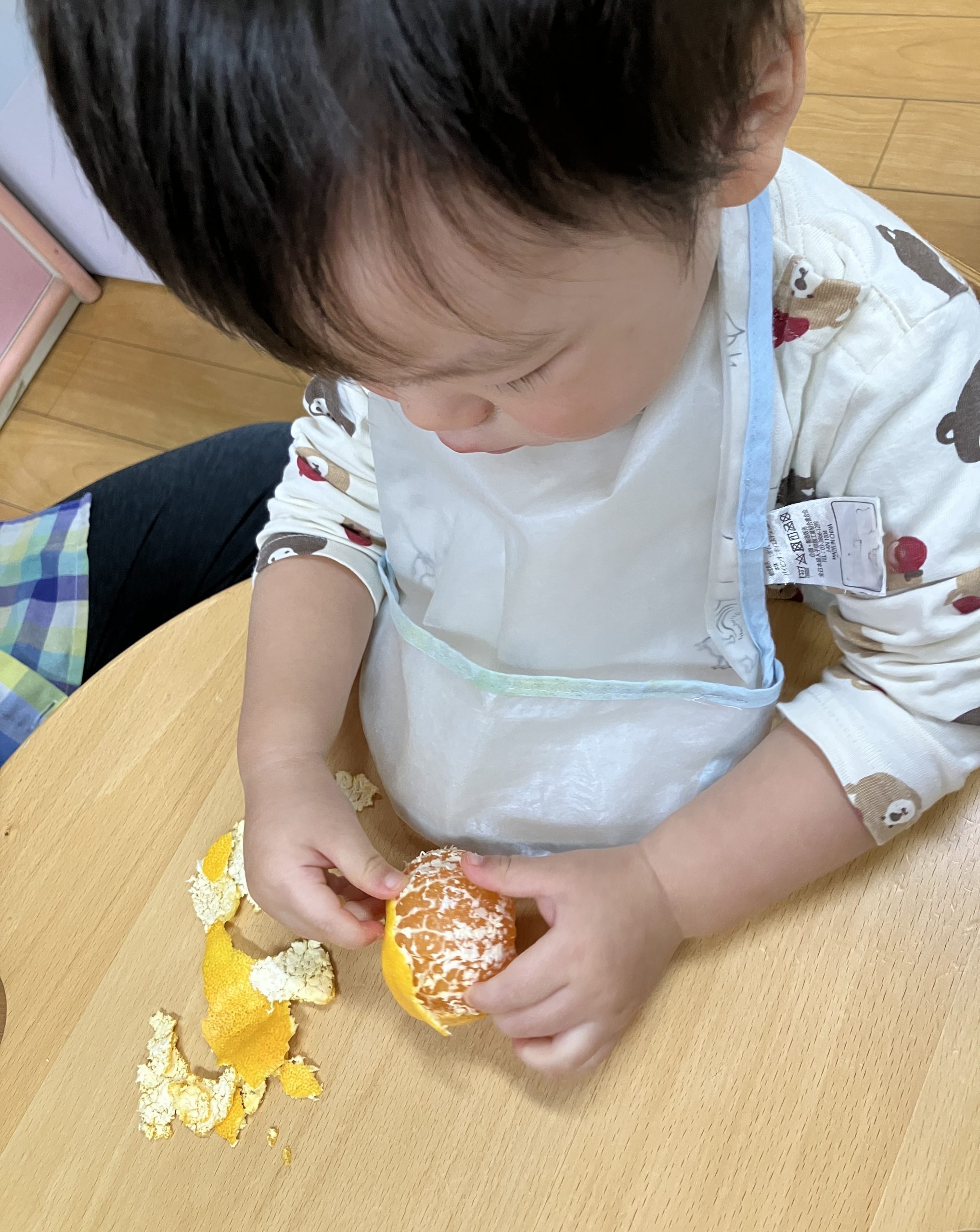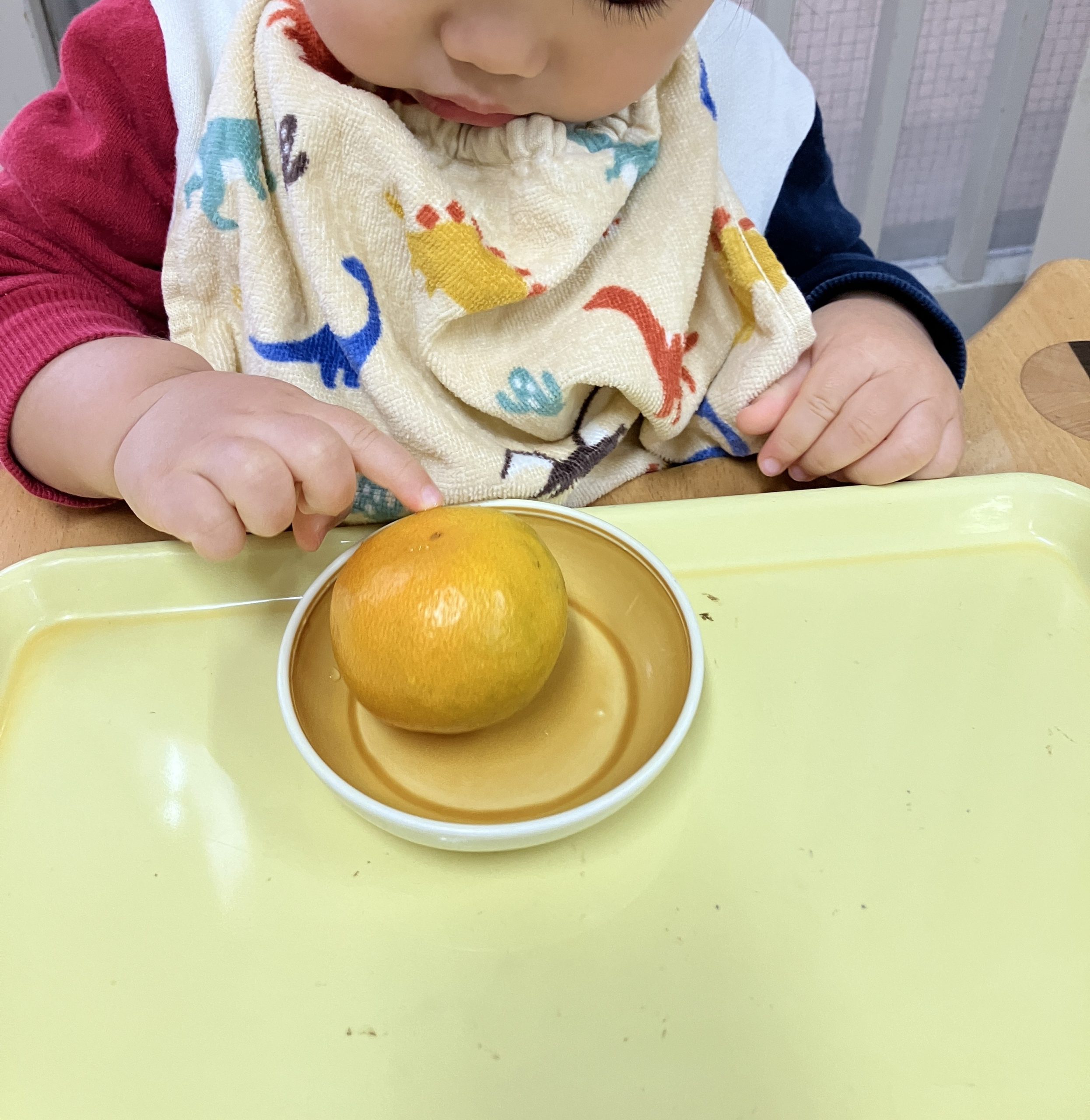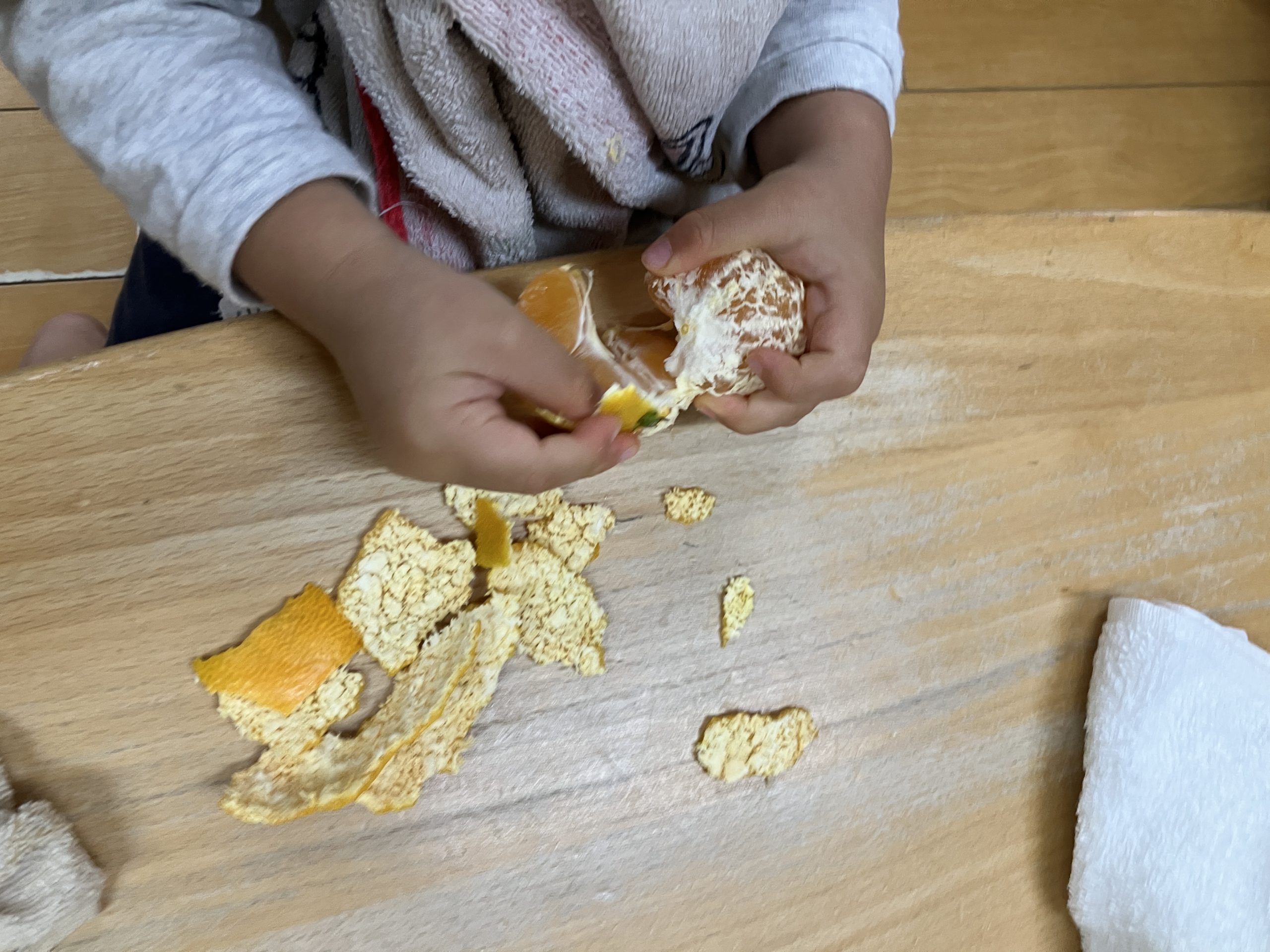みかん組(1歳児クラス)さん、いつもは給食室でみかんの皮を剥いてから提供していますが…