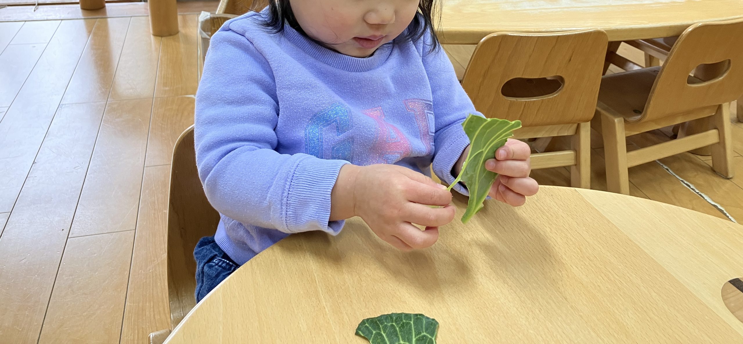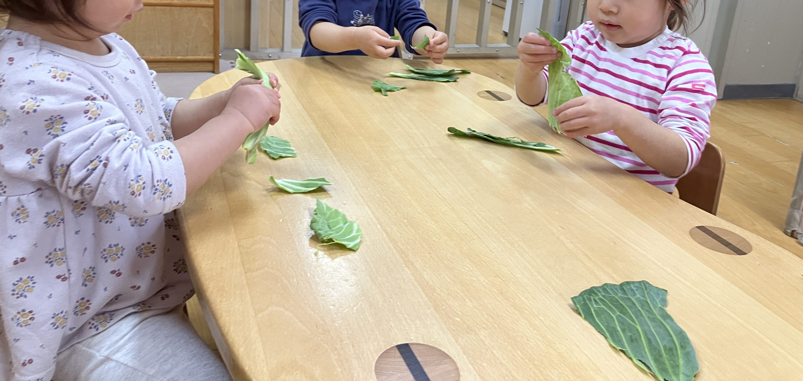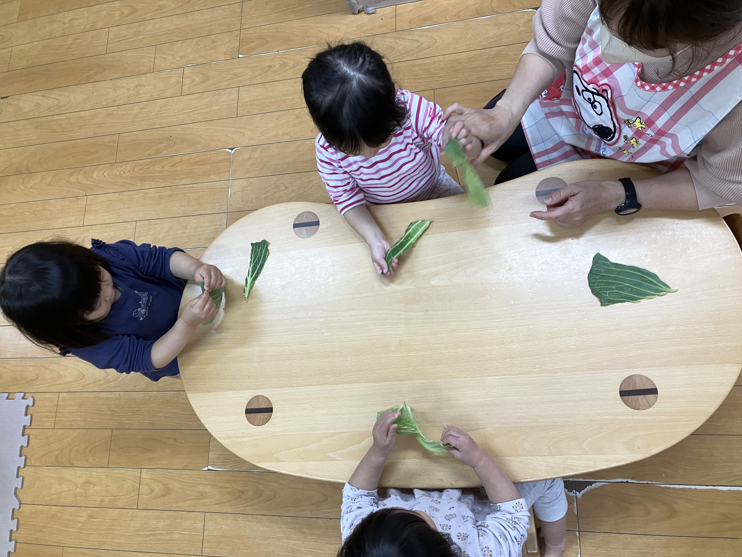 みかん組さん(1歳児クラス)で下処理のお手伝いをお願いしました。