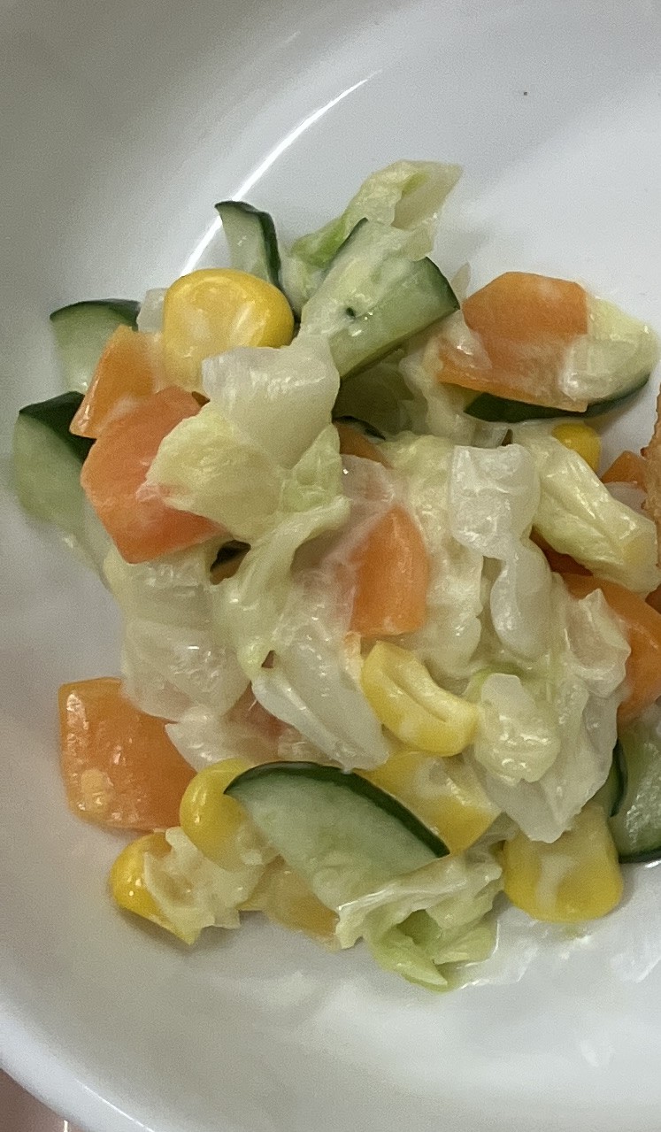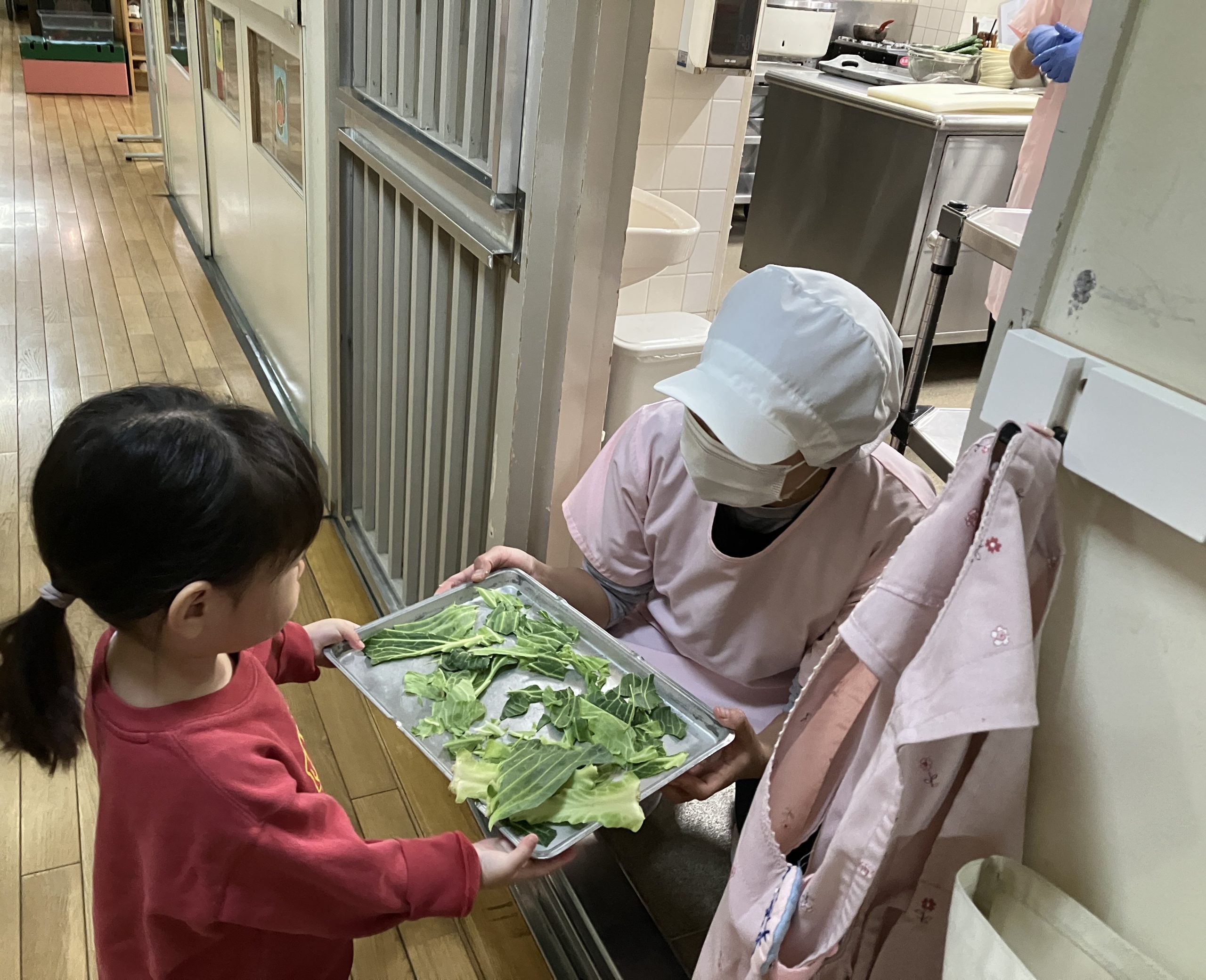 みかんさんがちぎってくれたキャベツは、給食室で細かくカットしてサラダに入れましたよ!