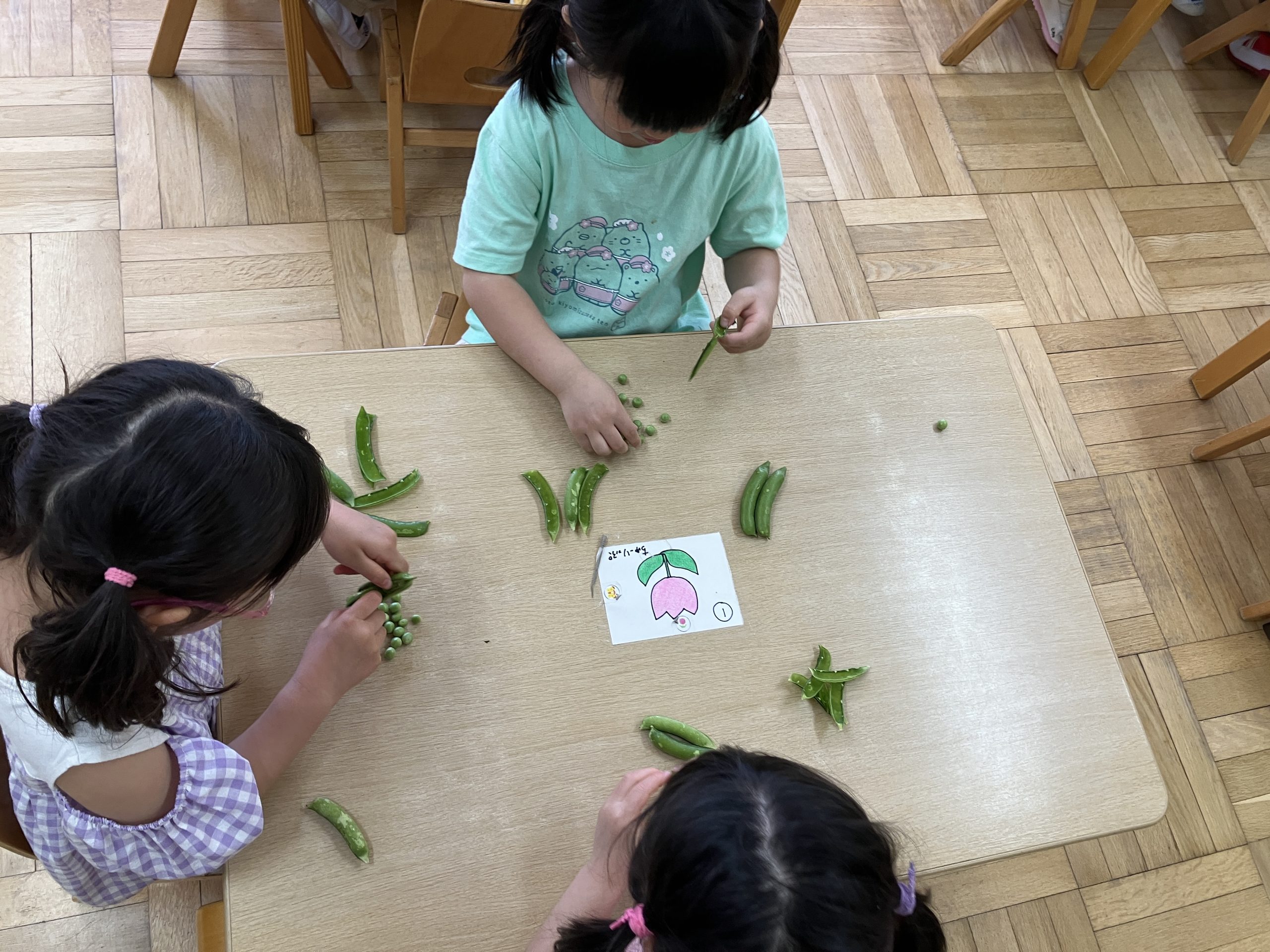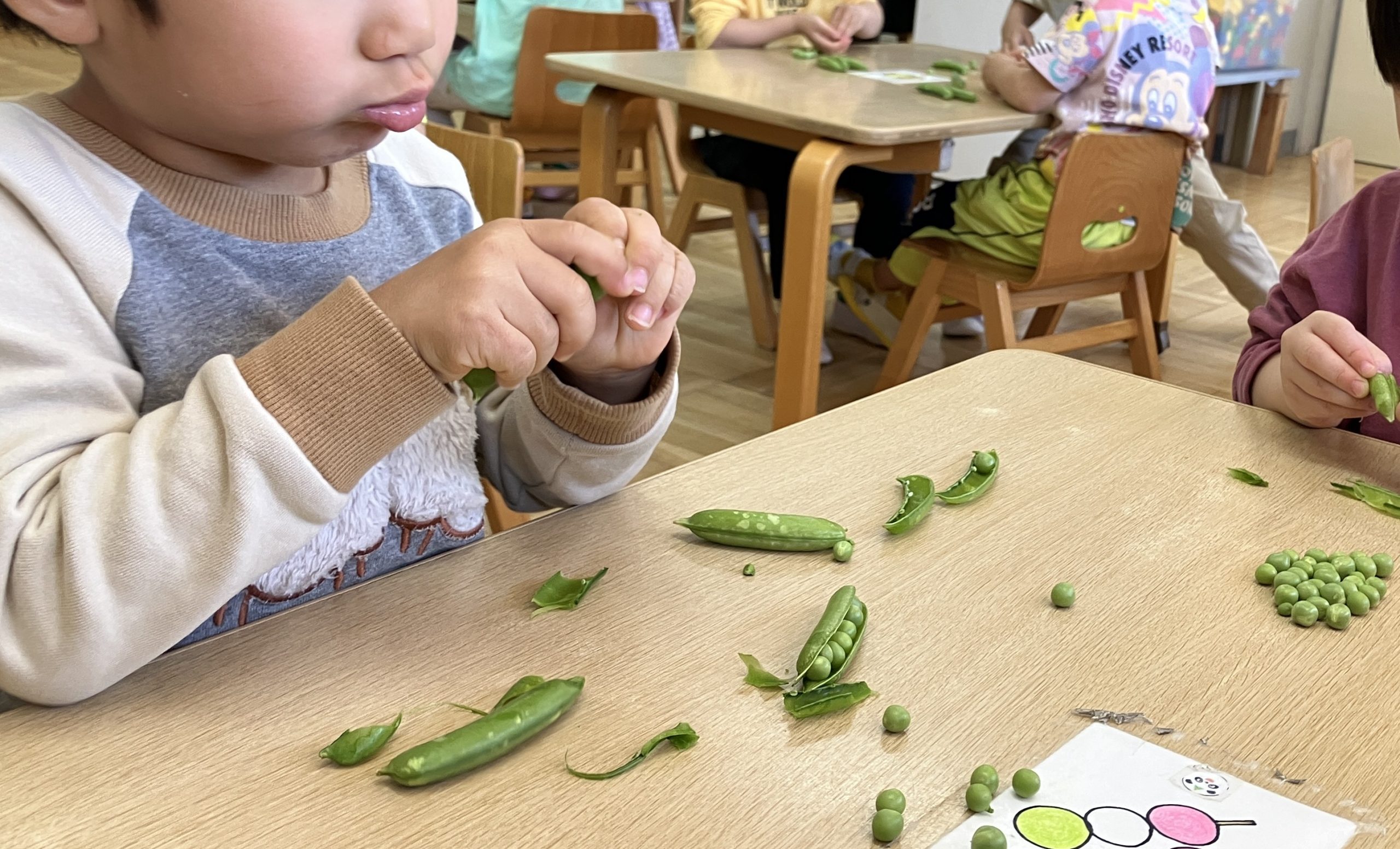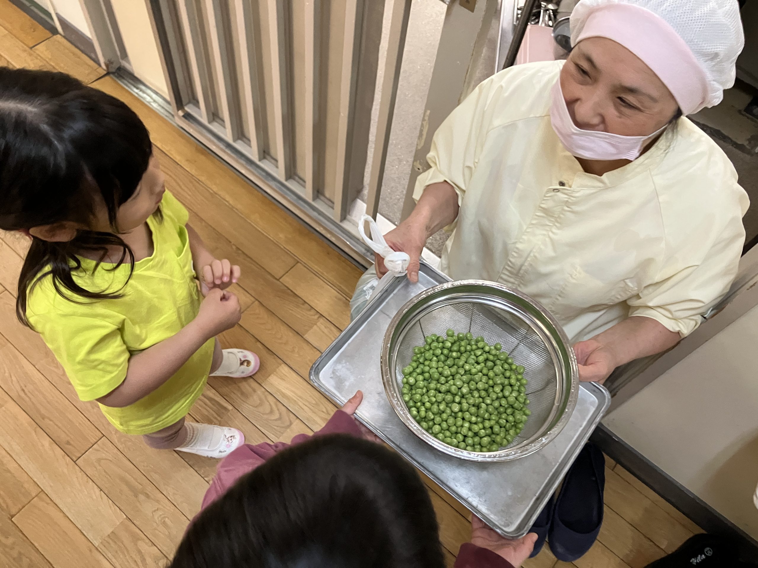 めろん組さん(4歳児クラス)にグリーンピースの鞘取りをお願いしました。
