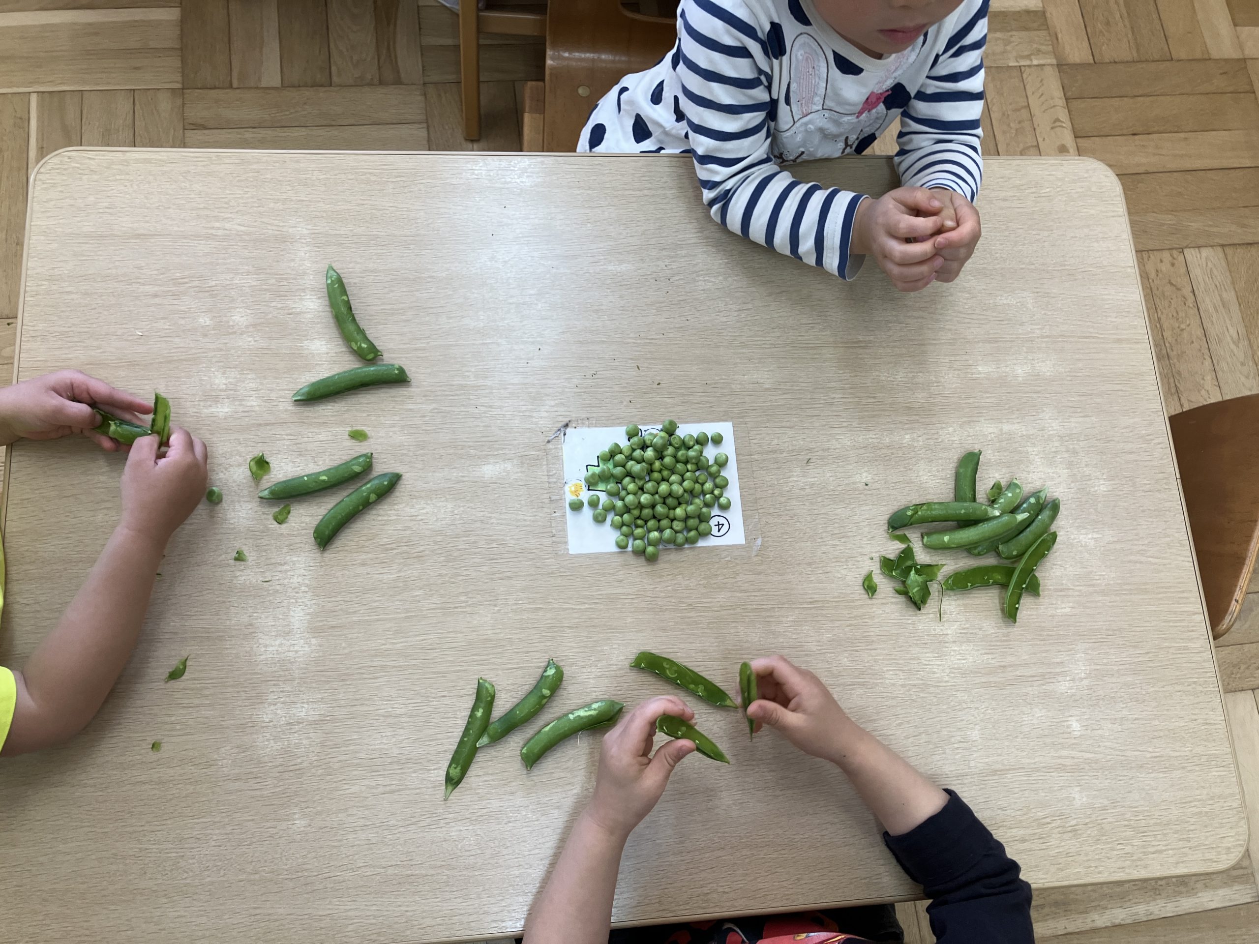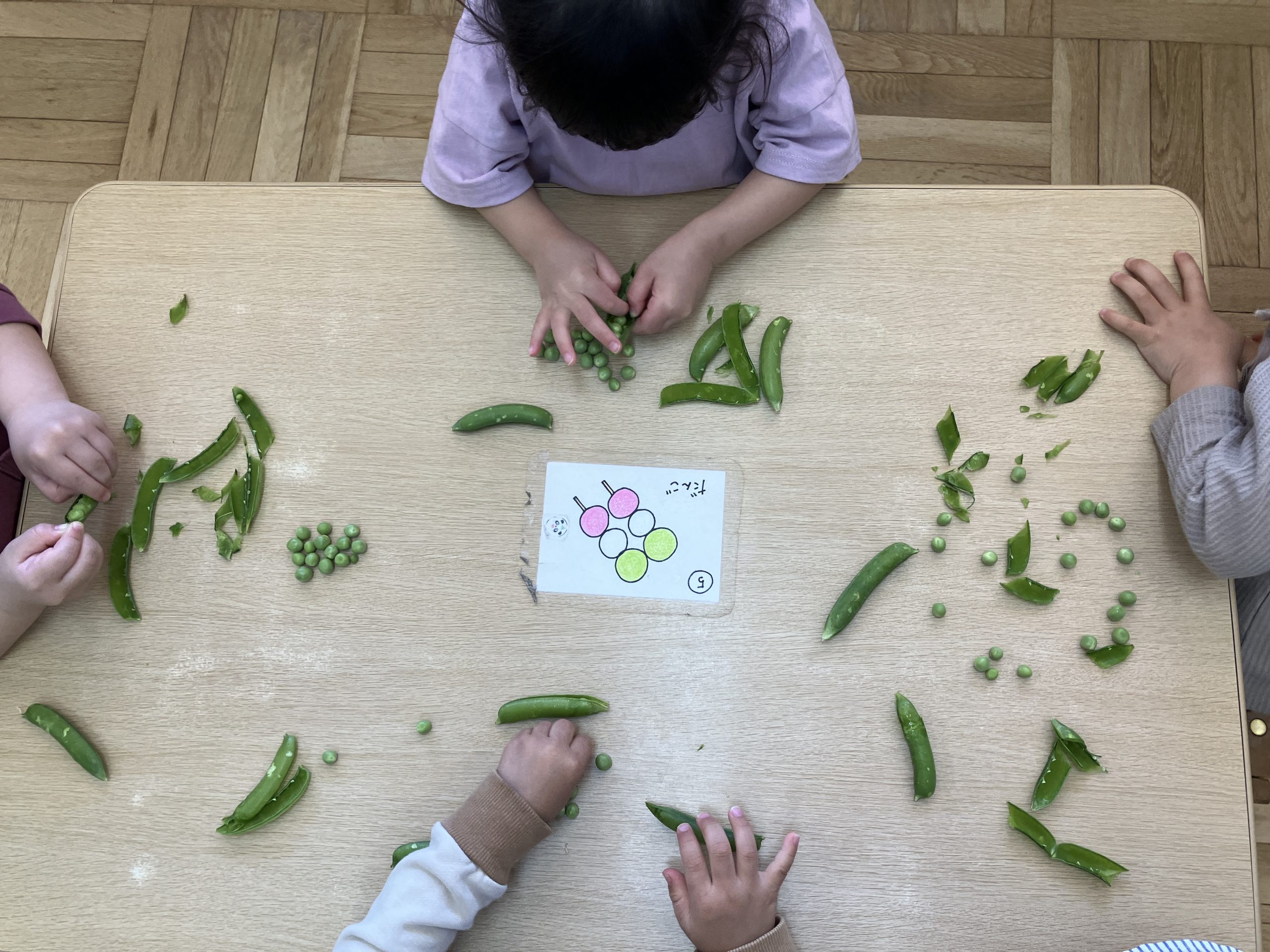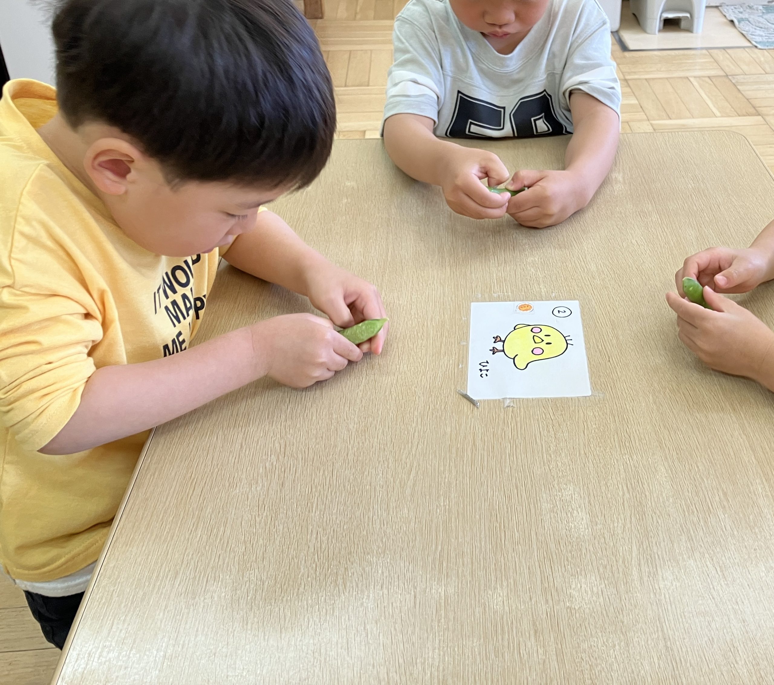 めろん組さん(4歳児クラス)にグリーンピースの鞘取りをお願いしました。