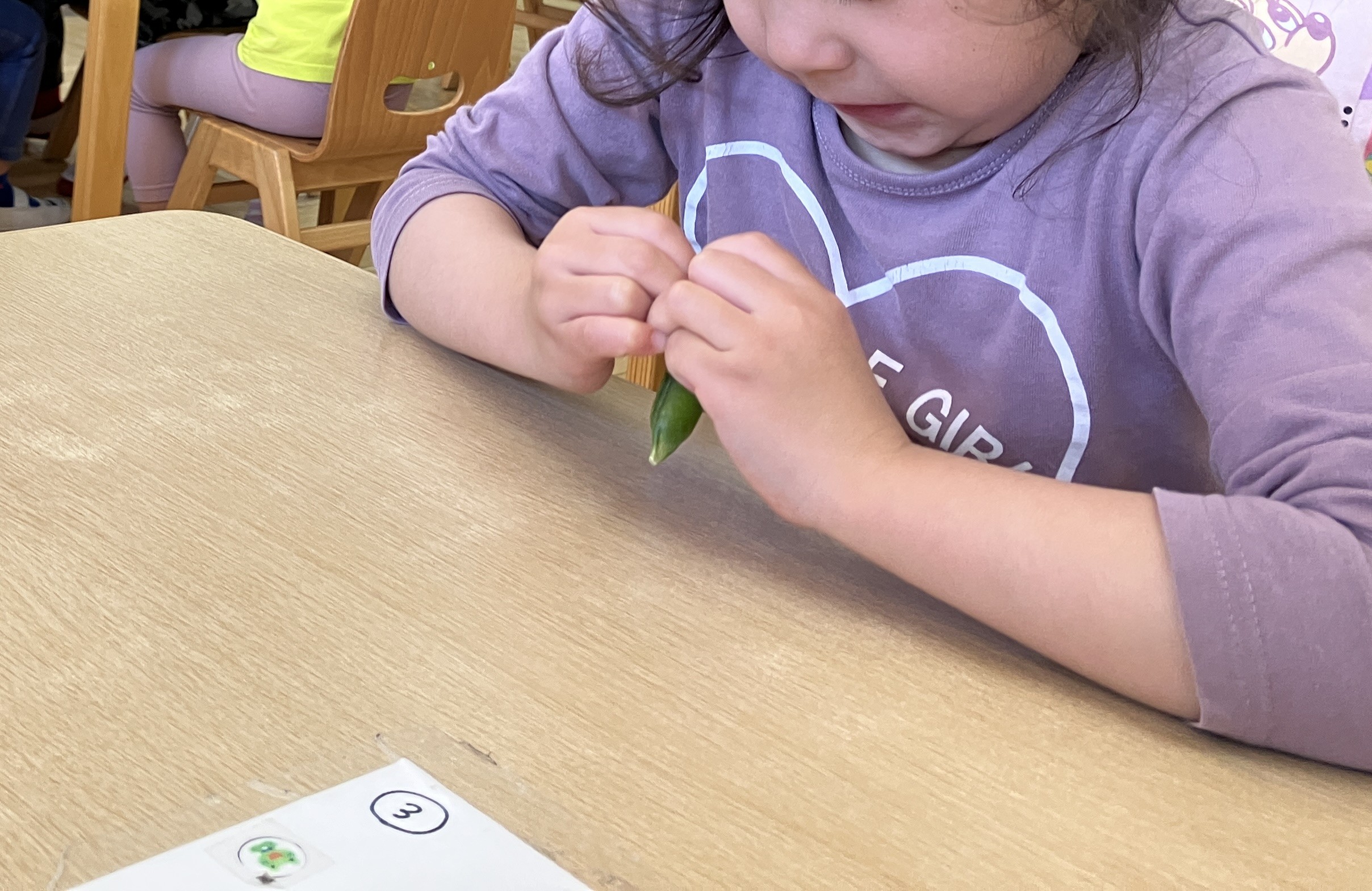 最初に栄養士がさやとりの見本をみせると、「すごーーーい!やりたーーーい!!」とやる気まんまんのめろんさんたち。