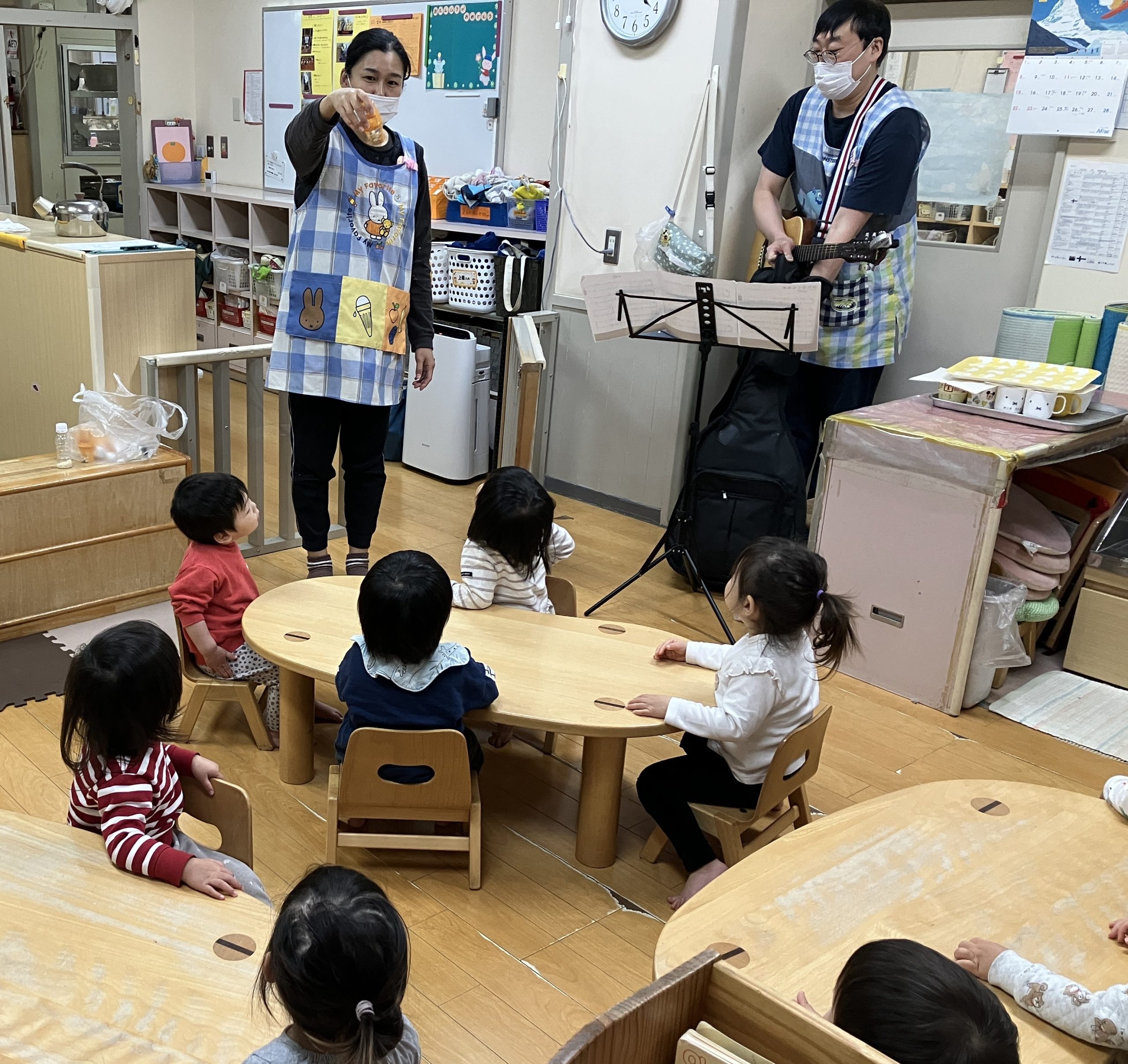 2月の下旬にマラカス遊びを行い、フリフリの仕方を予習していたみかん組さん(1歳児クラス)たち。