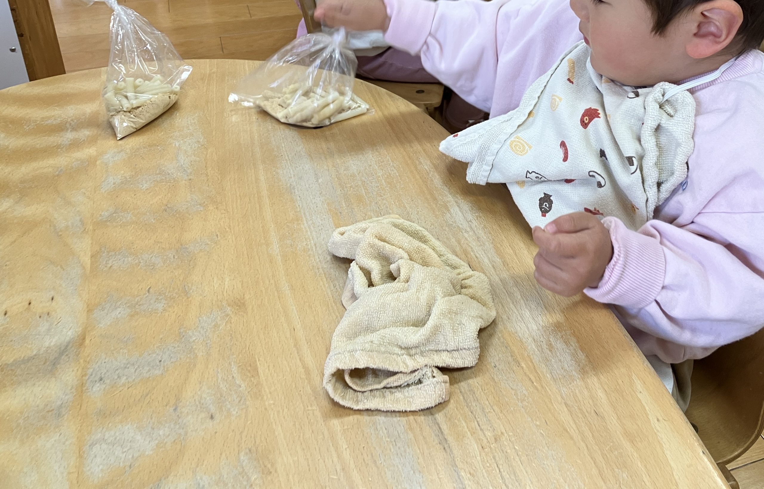 袋の中身は柔らかく茹でたマカロニときな粉と三温糖が入っています。