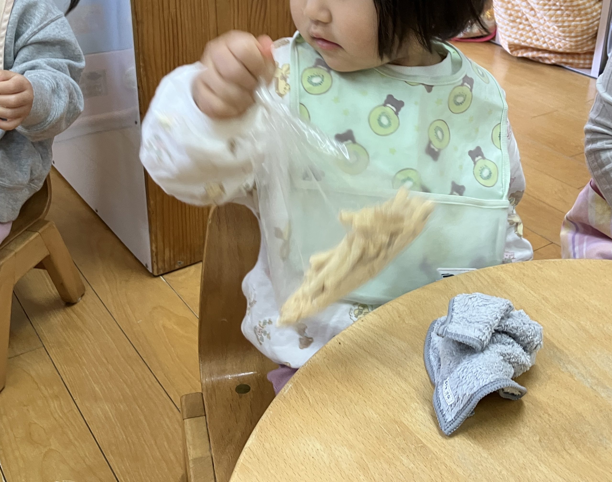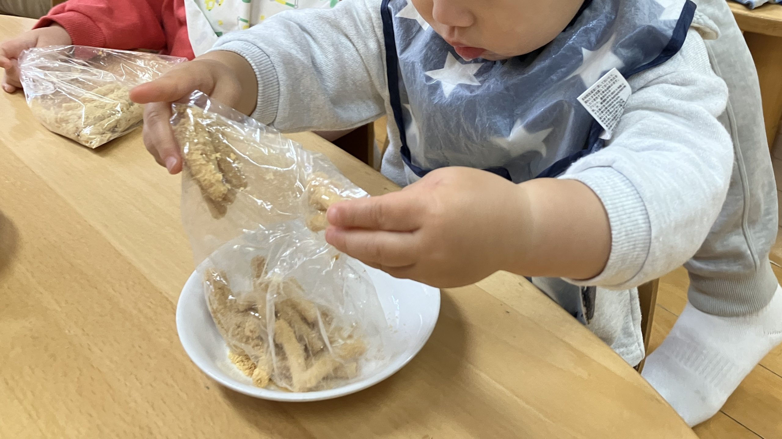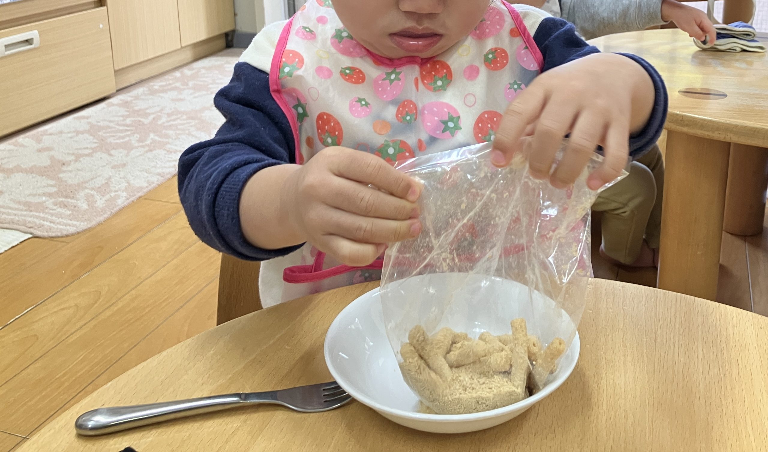 よーく振ったら、袋をハサミで切って(ハサミで切る作業は職員が行いました。)自分でお皿に移します。
