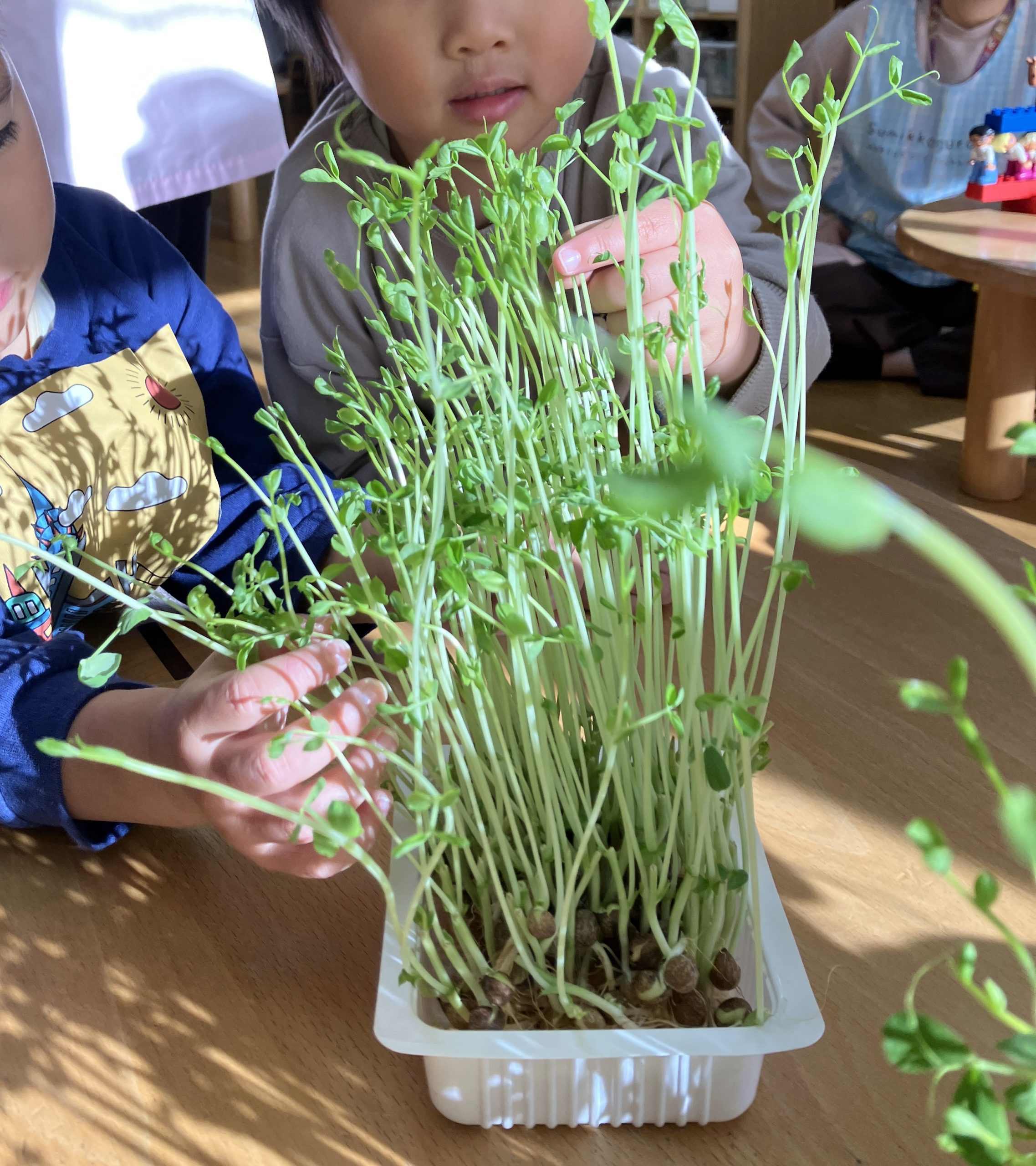 11/17(月)給食で使用した豆苗の根っこをりんごさんのお部屋へ。