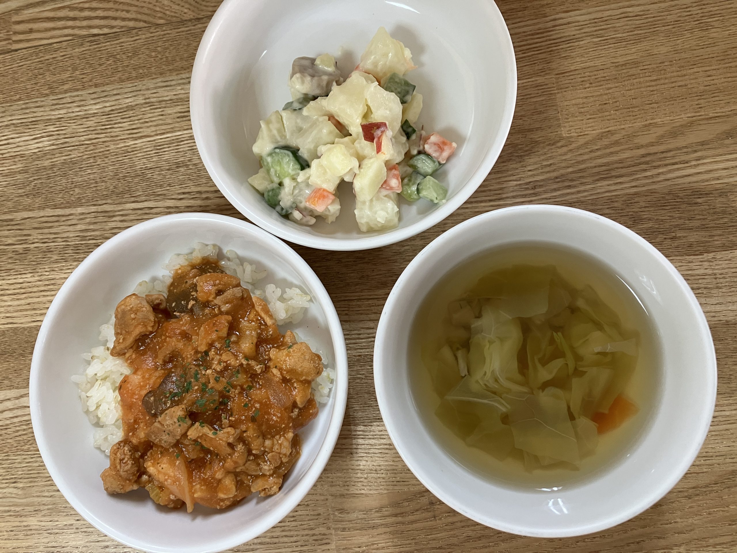 今日のメニューは【バターライス、ポークストロガノフ、オリヴィエサラダ、シチー】です。