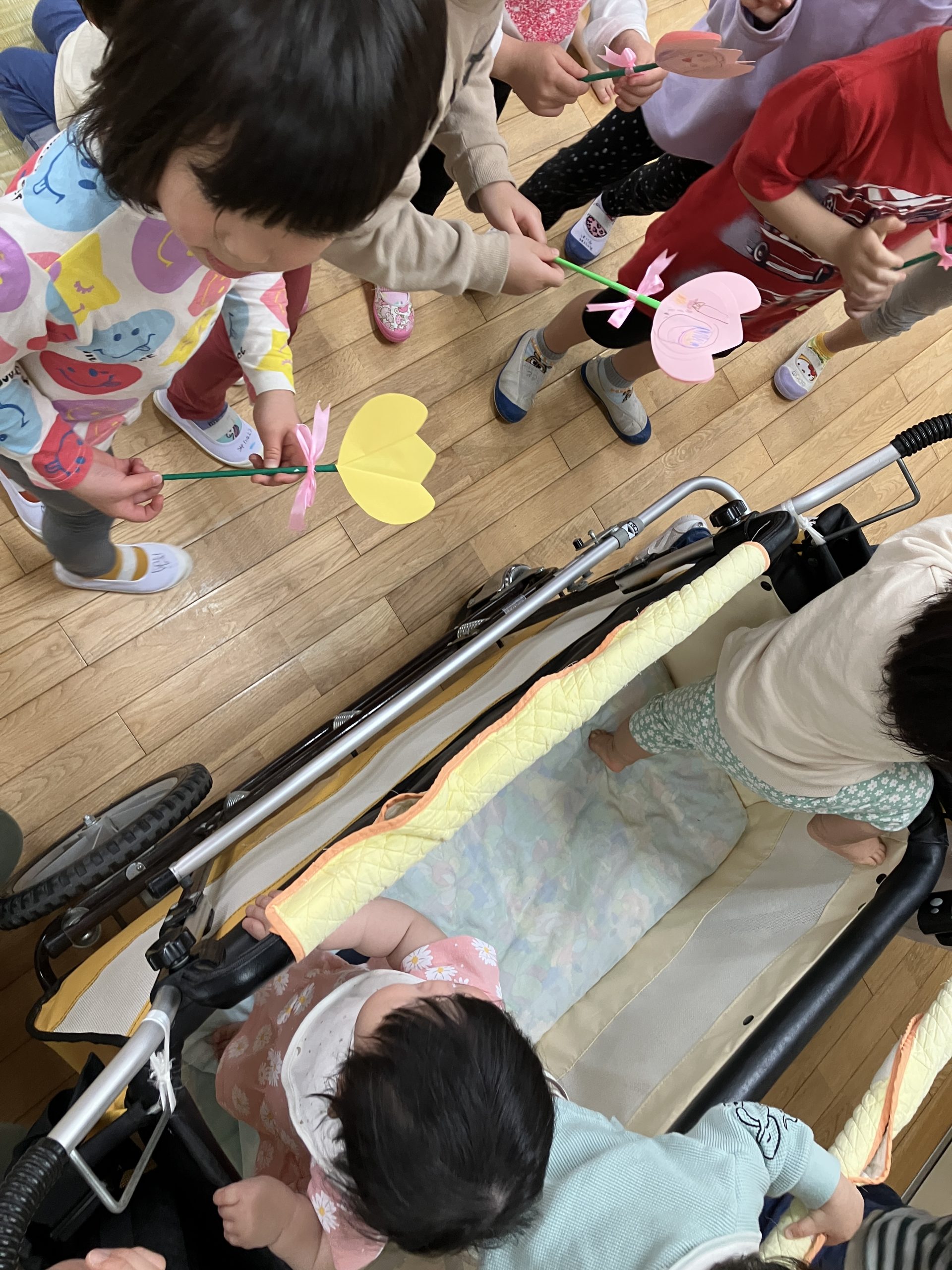 すいかさんから新しいお友だちへチューリップのプレゼントがありました。「どうぞ」とちょっぴり照れながら渡す姿や、もらって嬉しそうに大事に持つ姿がとても微笑ましく、温かい雰囲気に包まれました。