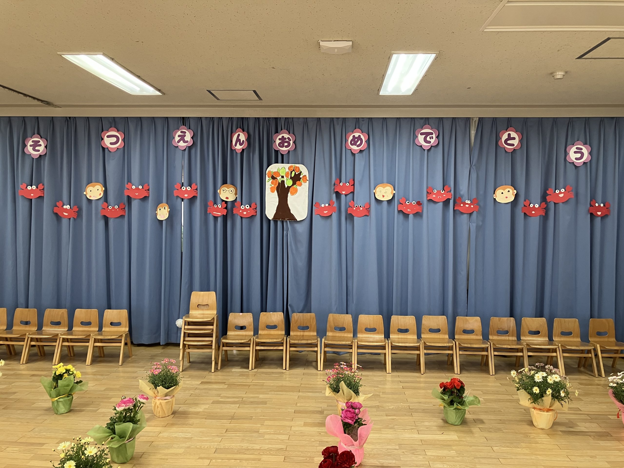 会場の様子です。すいかさん(5歳児クラス)がお楽しみ会で演じた【さるかに合戦】がテーマ!