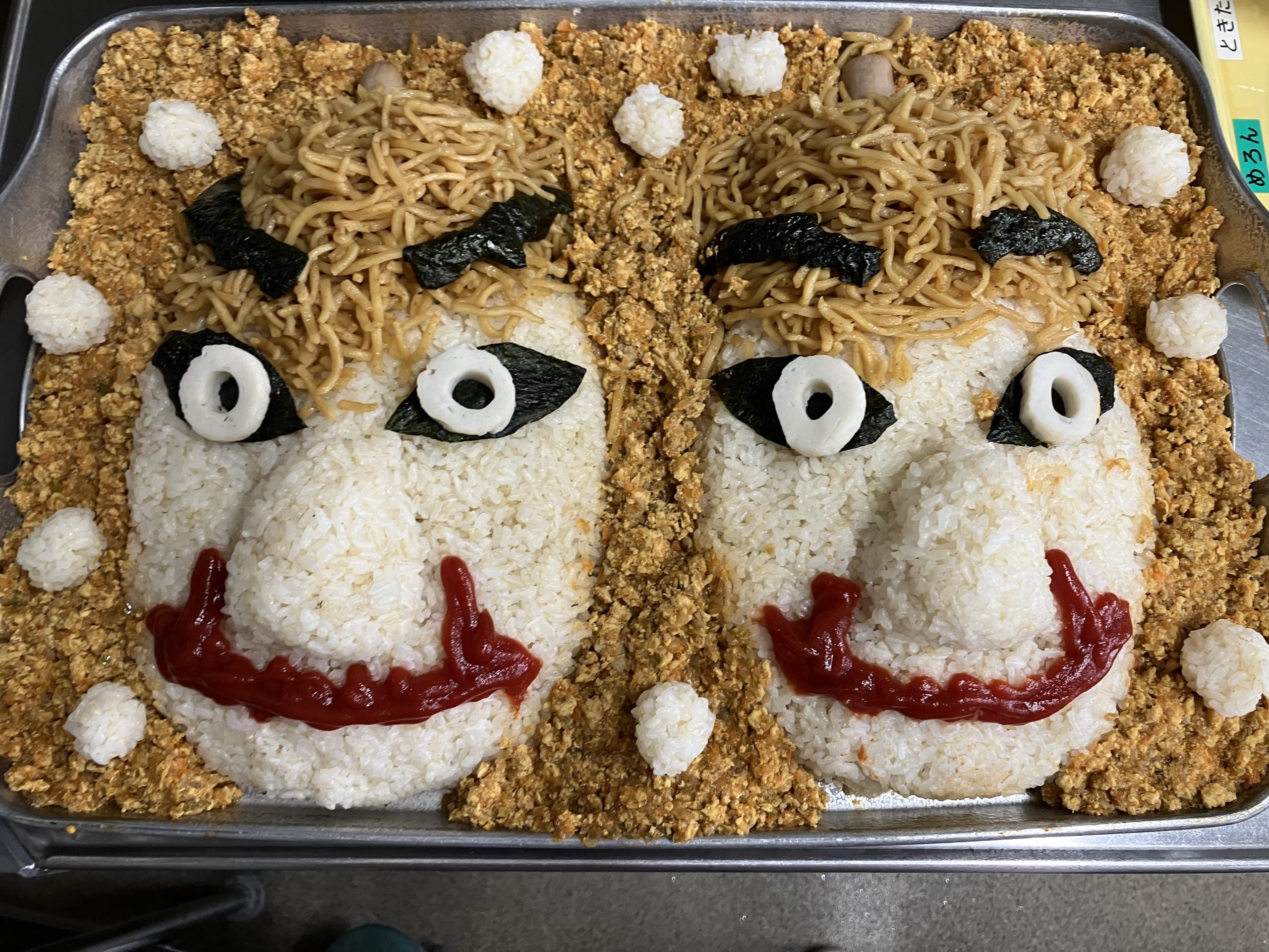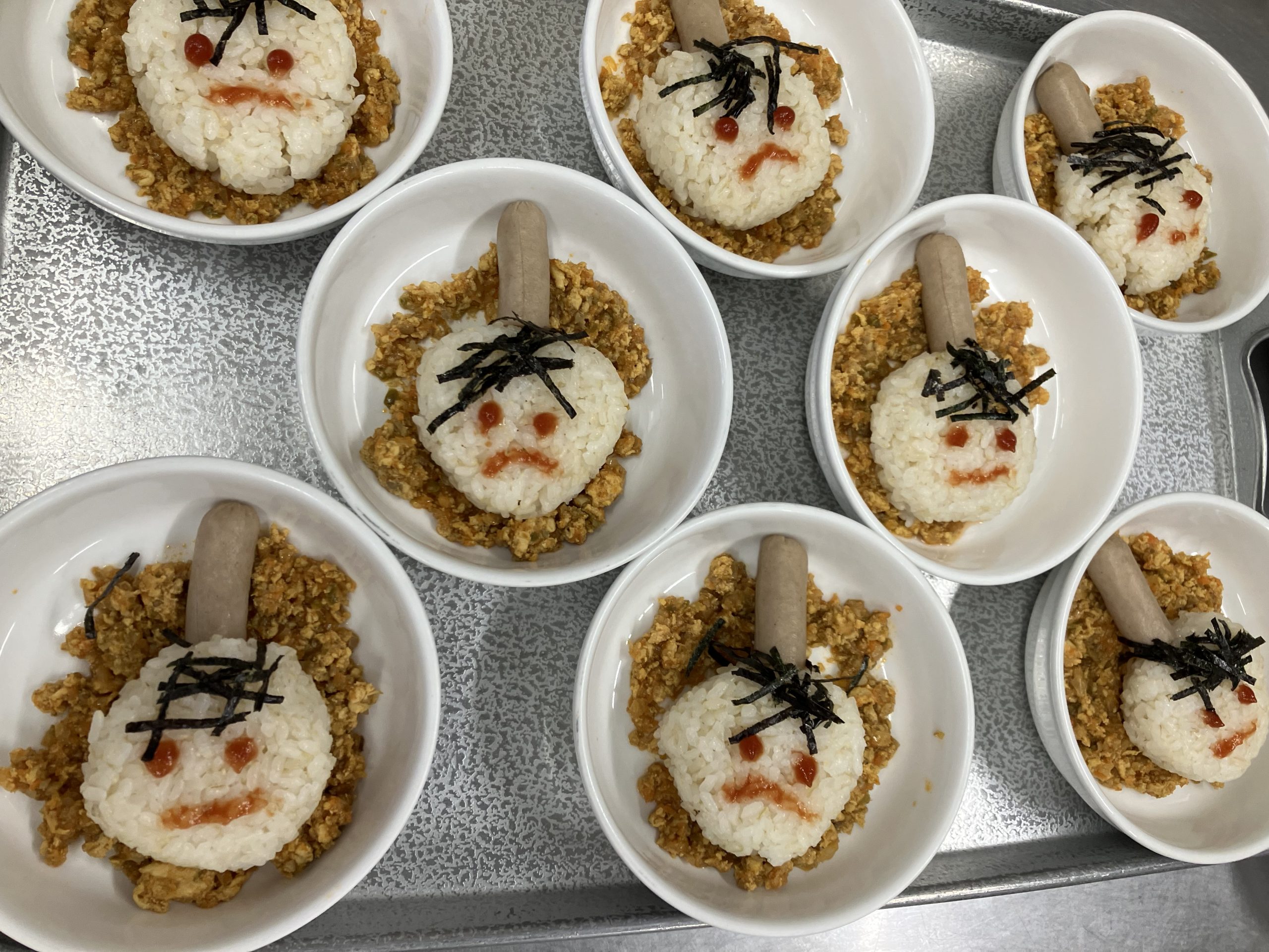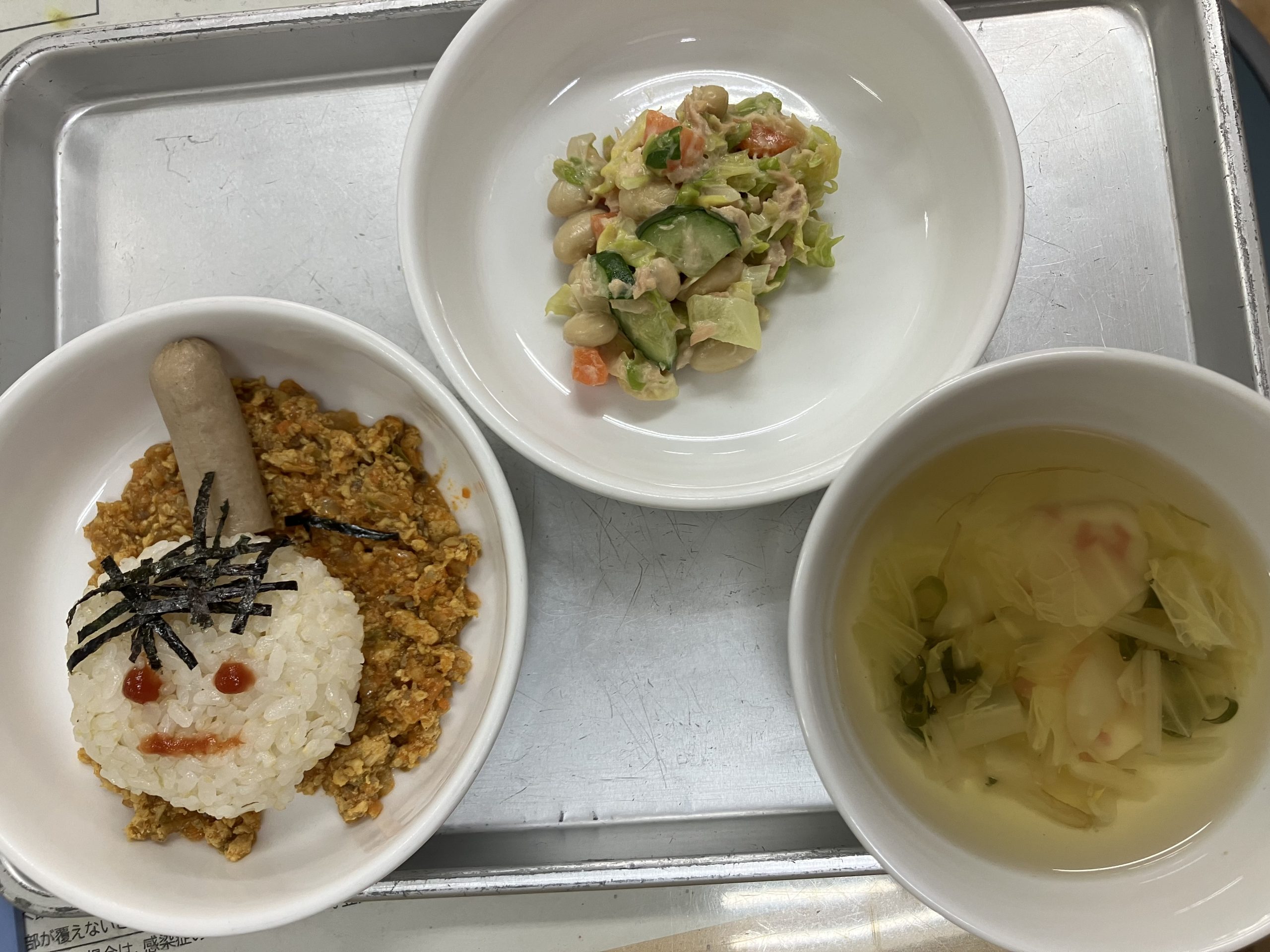 今日の給食:鬼のドライカレー丼、大豆のサラダ、鬼かまぼこ入りすまし汁