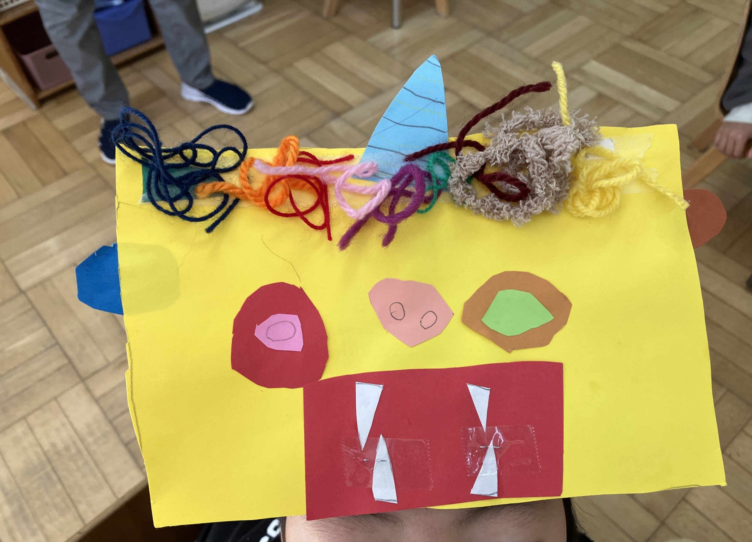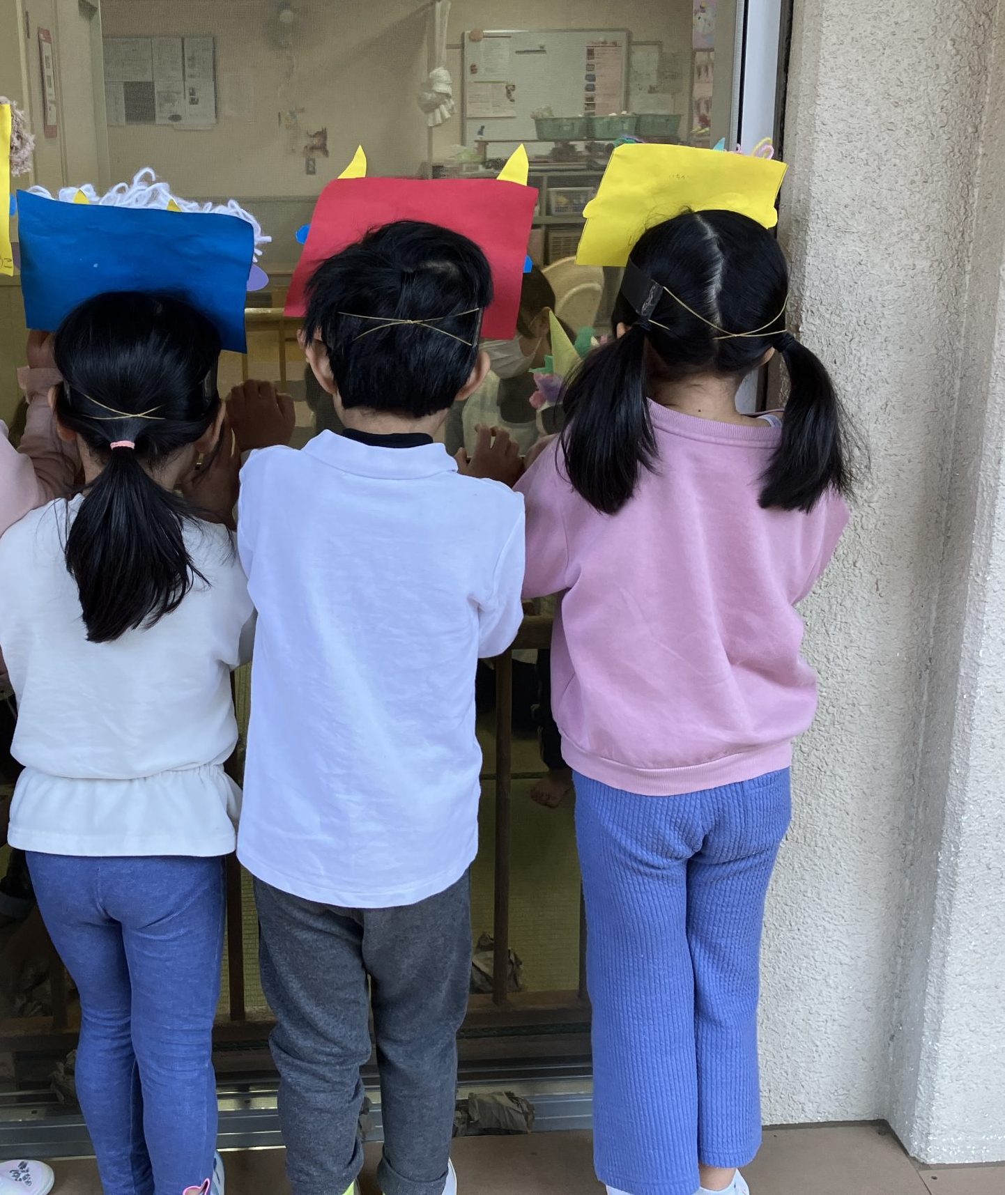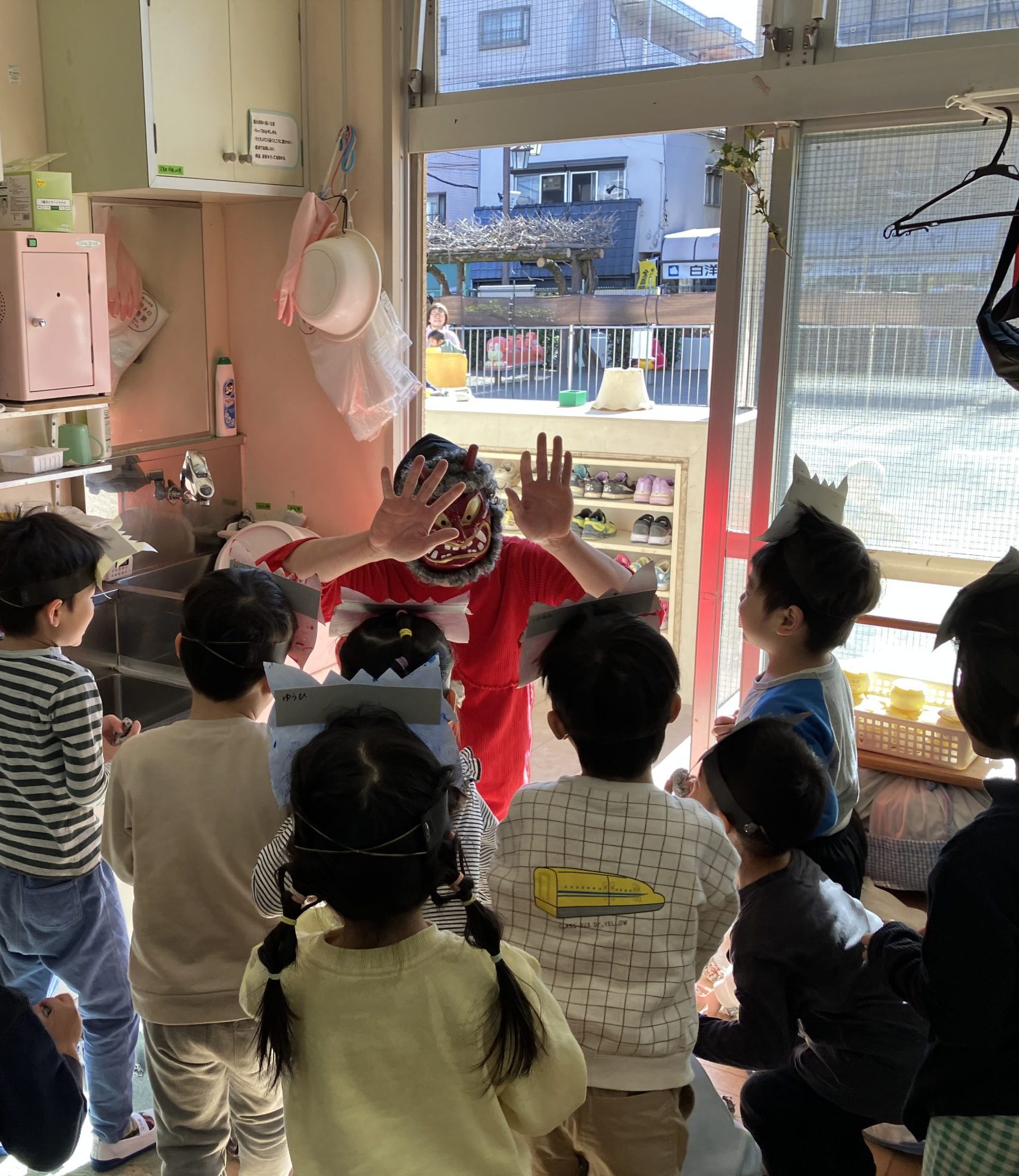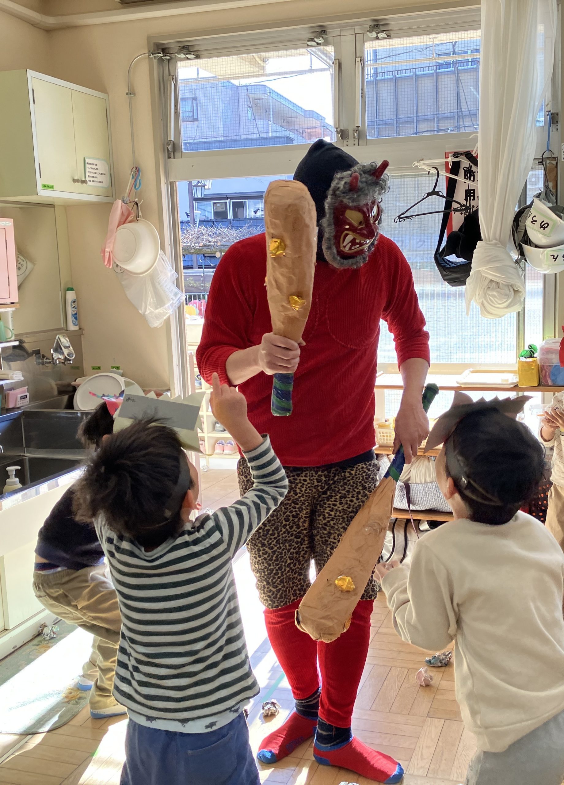 すいか組さん(年長さん)の子どもたちが鬼役となり、自分たちで鬼のお面を作って、各クラスへ行きました。