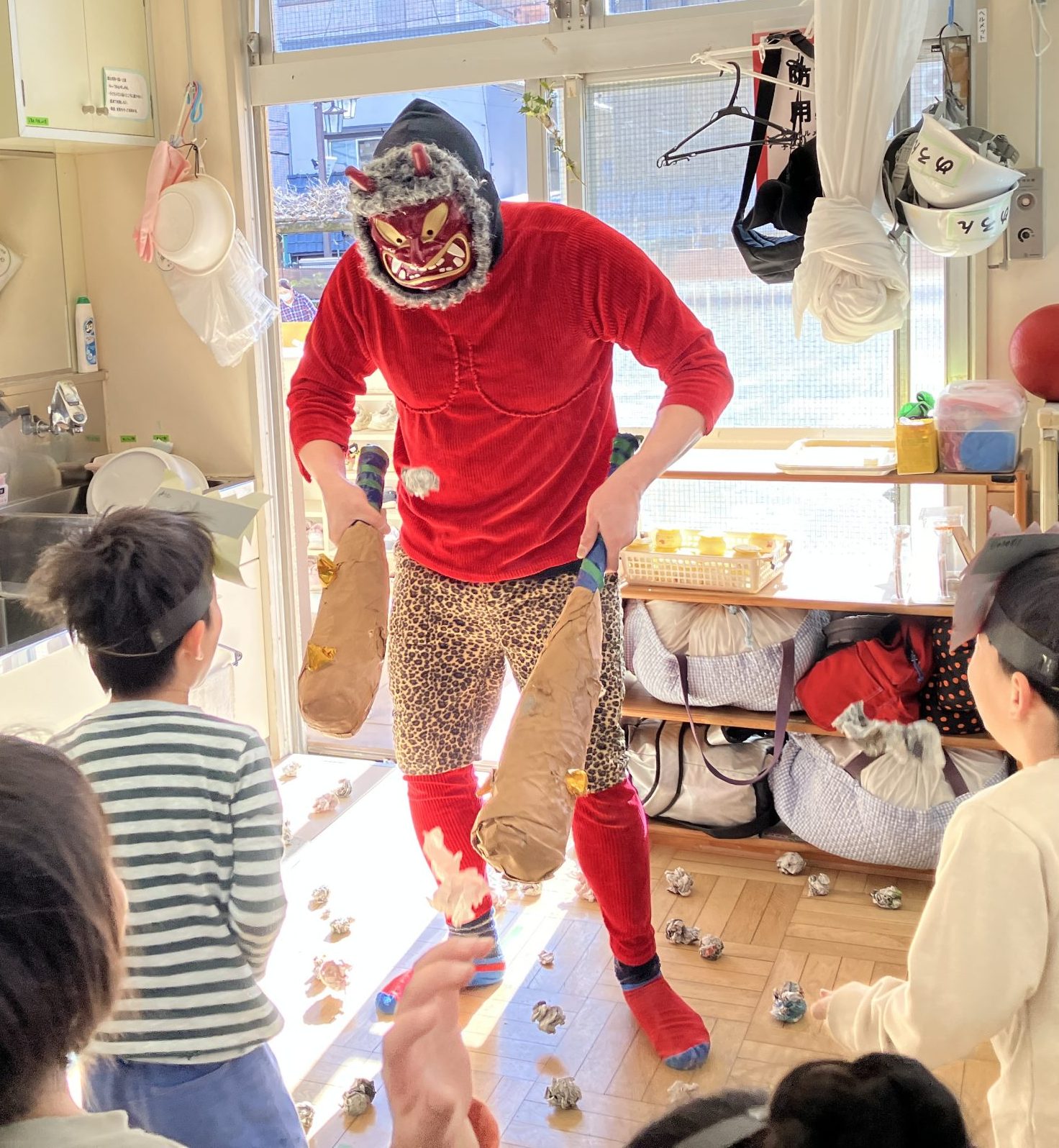 子どもたちは大きな声で「おにはそと~!」「おにはそと~!」と言って新聞紙で作った豆を投げていました!