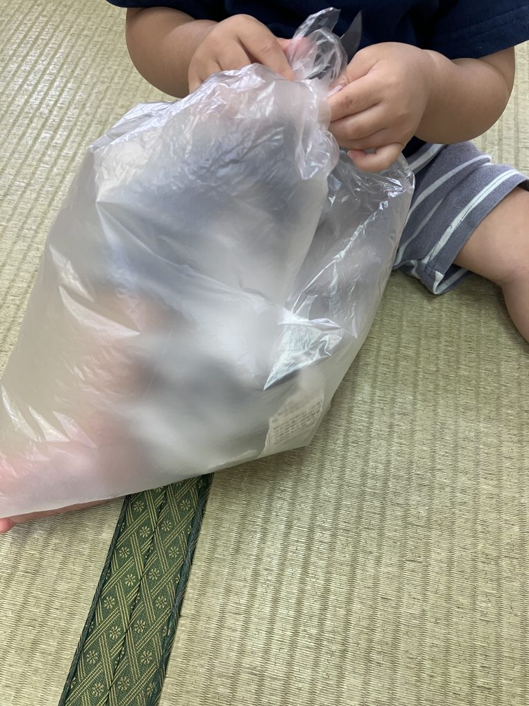 遊び終わった後のお片付けは、ビニール袋に細かくちぎった新聞紙を入れて、空気を少し入れてふくらませるとまたまた遊び道具に!!しゃかしゃかと音を鳴らしたり、風船のようにして遊んでも楽しいですよ。