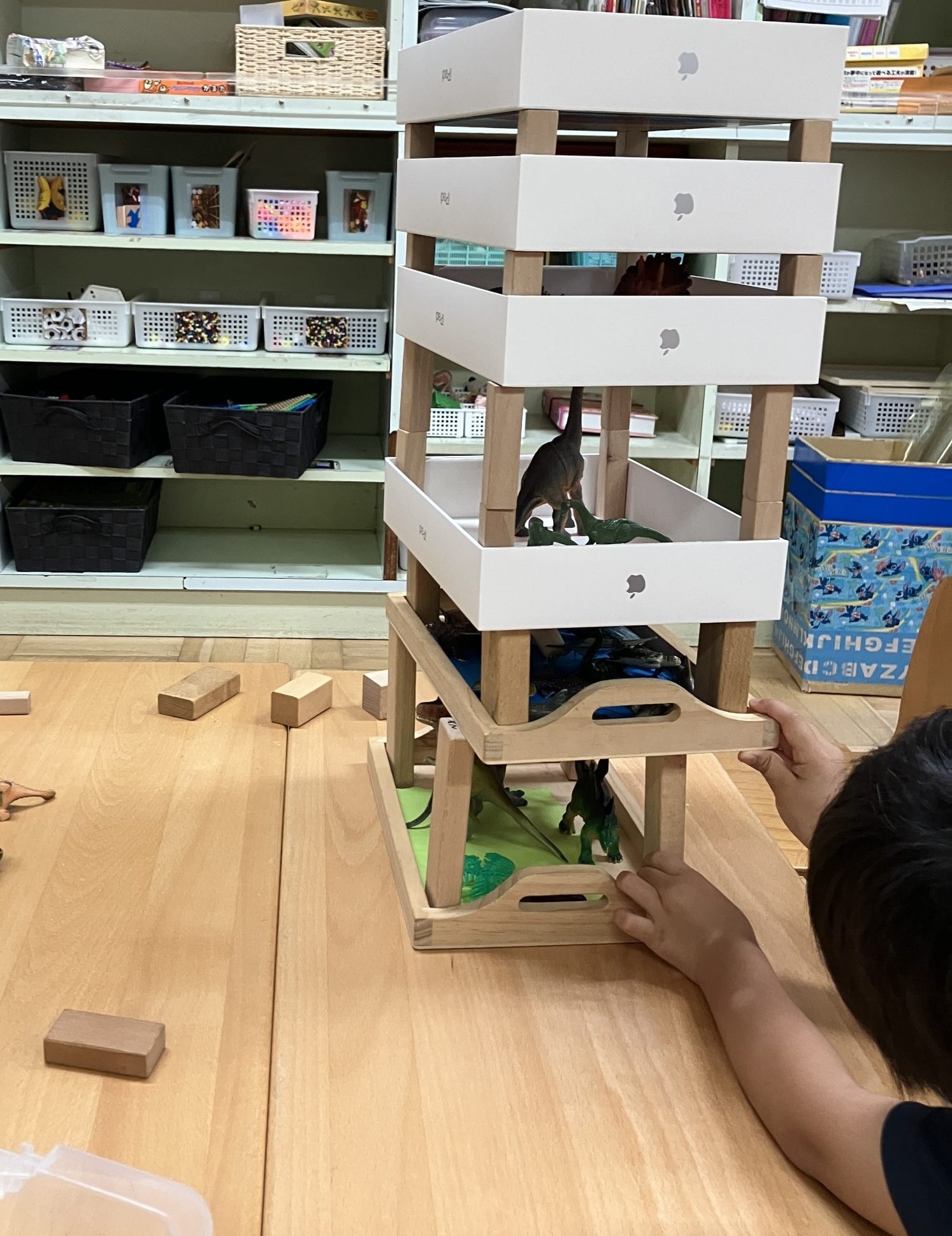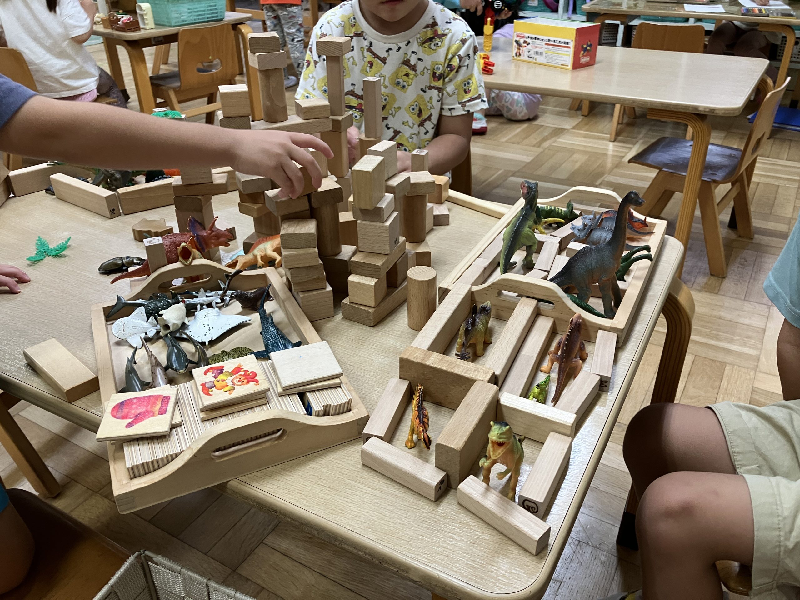 保育園で実践してみたところ、恐竜や魚のおもちゃも一緒に使うことで積み木で恐竜が活動する山や恐竜や魚が住む家を作って楽しんでいました。