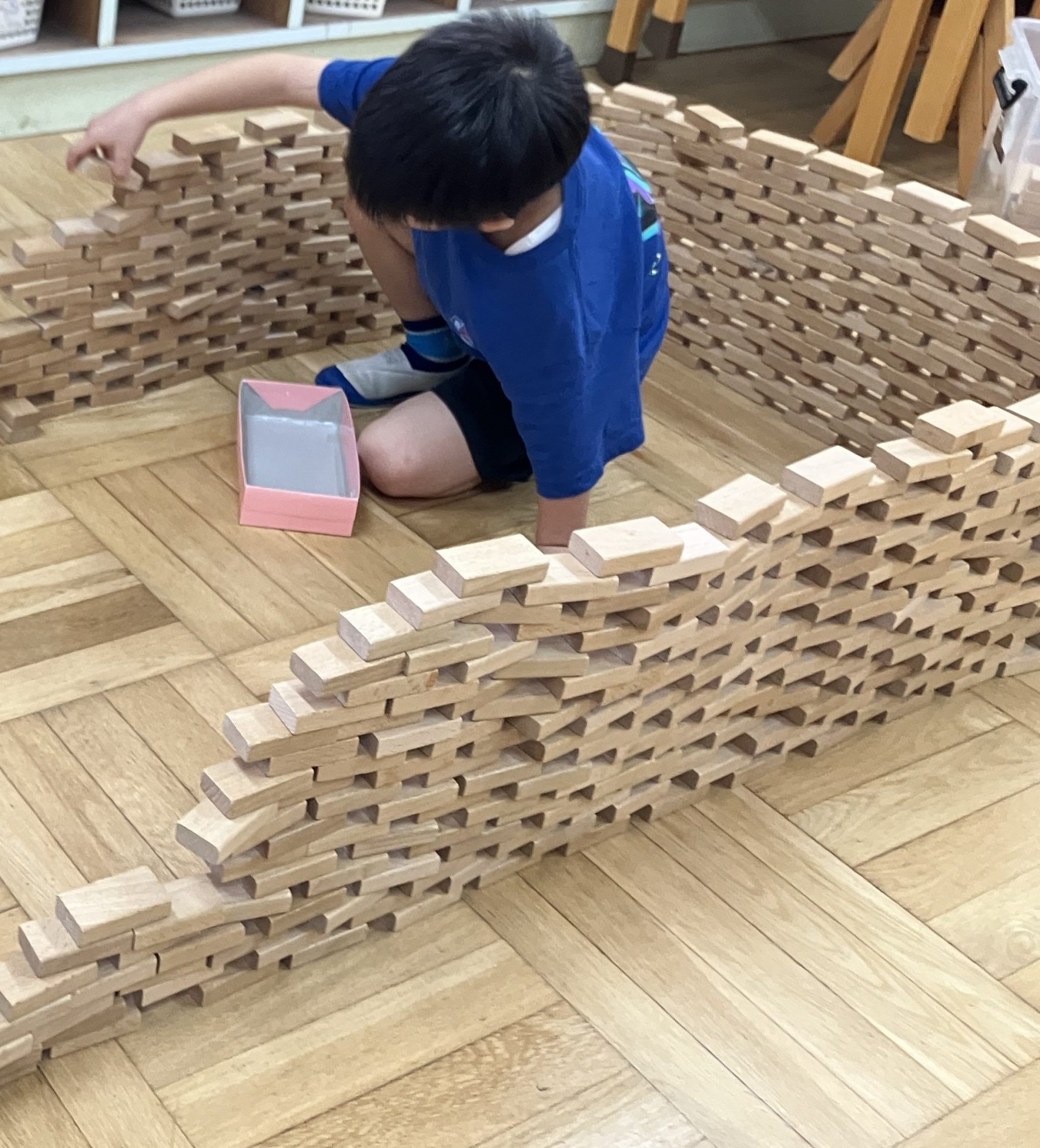 集中して、小さい手で1つ1つ積み木を丁寧に積んで並べていき、最後には大きな作品を作ることができていました。