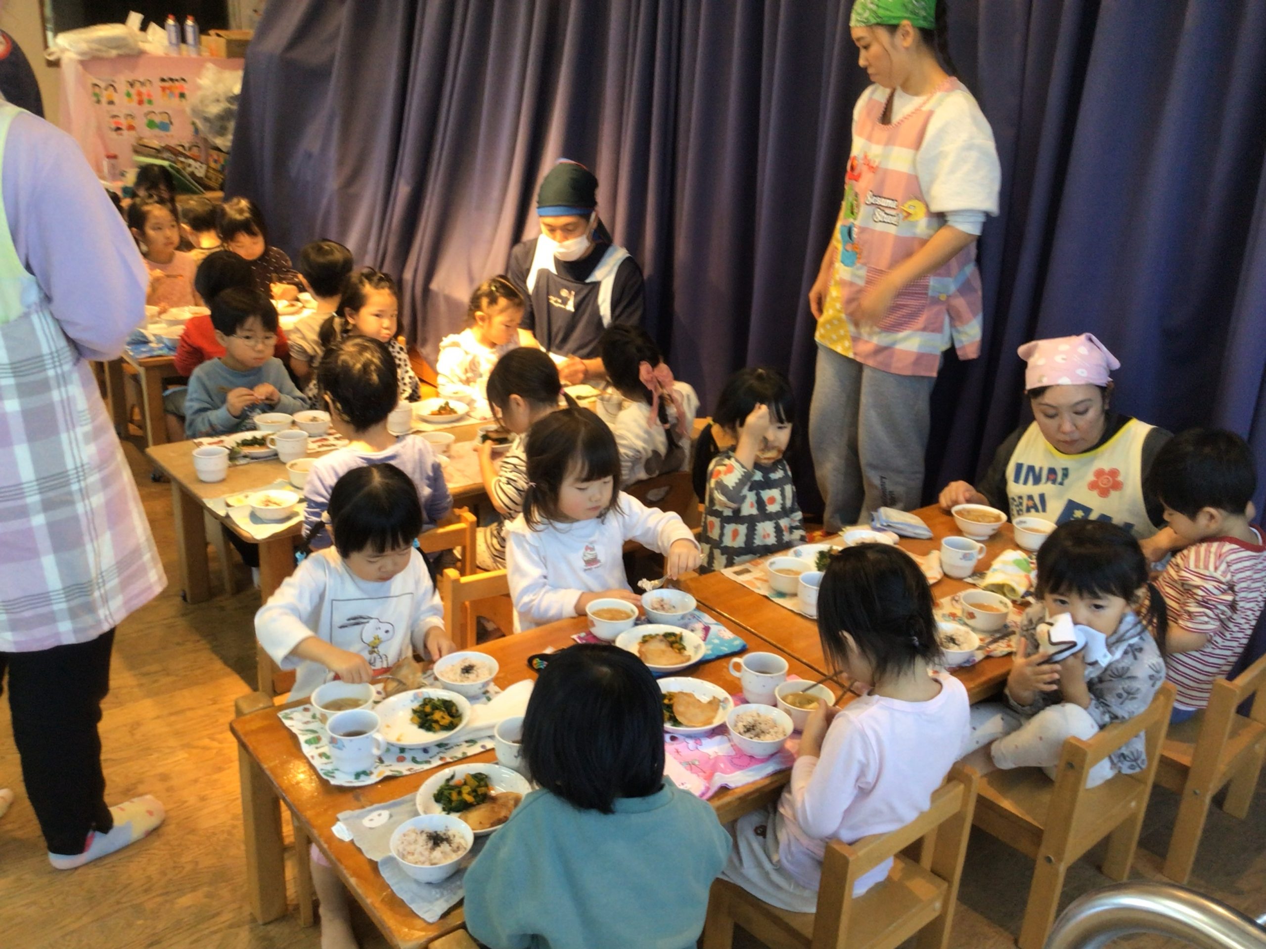 今日は各クラスで作ったものを持ち寄って、ホールでみんなで給食を食べました。
