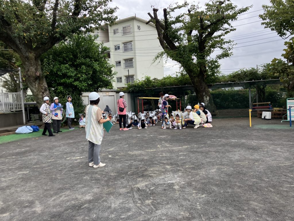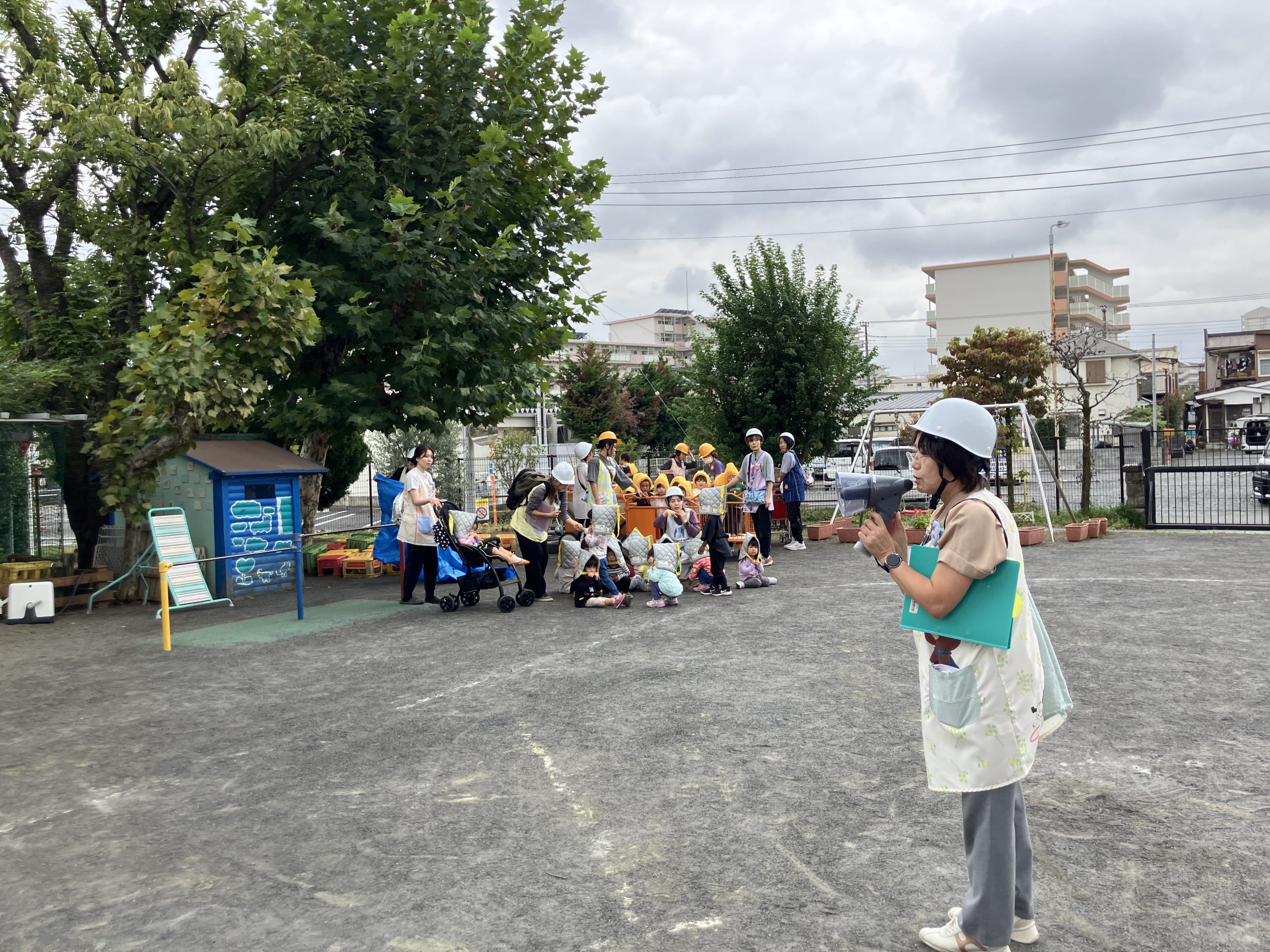 震度5の設定で各クラスで地震の訓練後、給食室から出火想定で園庭に避難し、人数確認をしているところです。保育者の話をよく聞いて全クラス避難できました。出火して園庭も危ないので、これから10小に避難します。