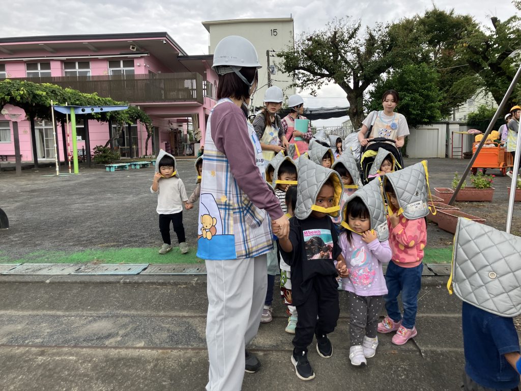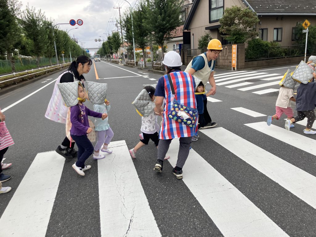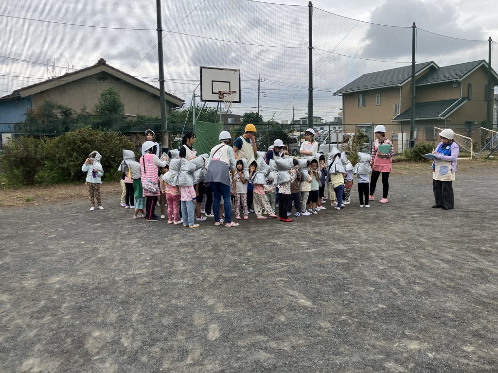 10小に到着して、副校長先生からもお話しをして頂きました。避難の仕方を「とても立派です。」と褒めて頂きました。防災頭巾を被るなど、歩きにくい中、お話もせず頑張っていました。小さいクラスのお友だちもバギーに乗って無事に避難できました。