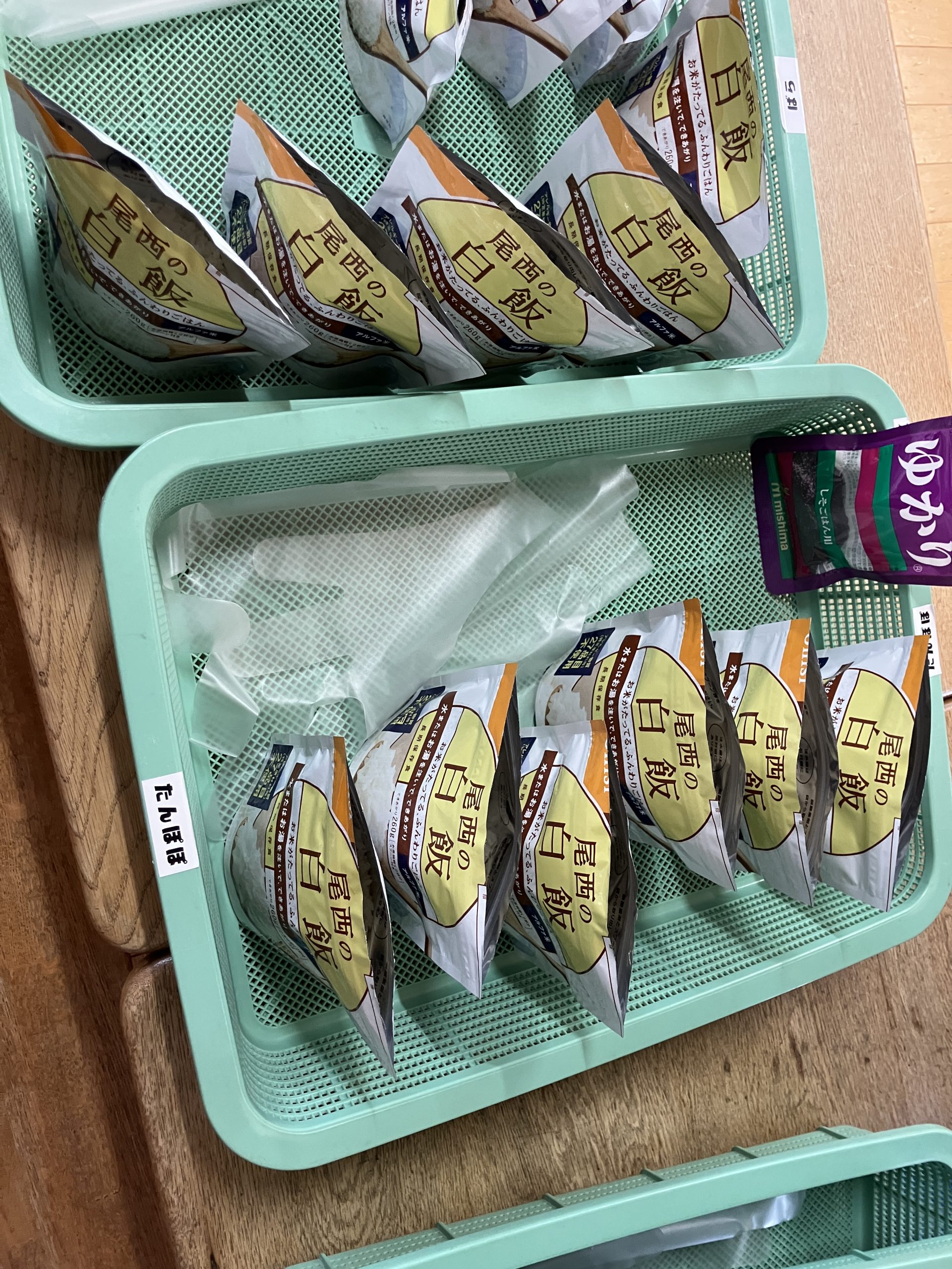 炊き出し訓練で作ったご飯を、各クラスで保育者が握ったおにぎりをおやつで食べました。停電の設定でお部屋が暗い中で食べるのが、いつもと違う雰囲気で新鮮だったようです。