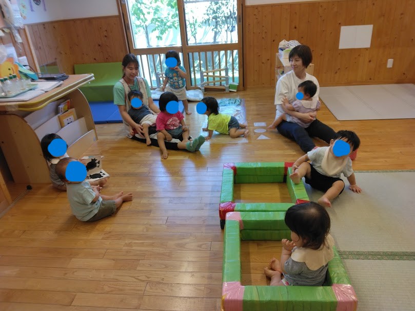 膝の上に乗って電車ごっこを楽しんだり、プチプチの上を四つ這いで歩いて刺激を感じたりとお部屋の中でも楽しんでいます☆