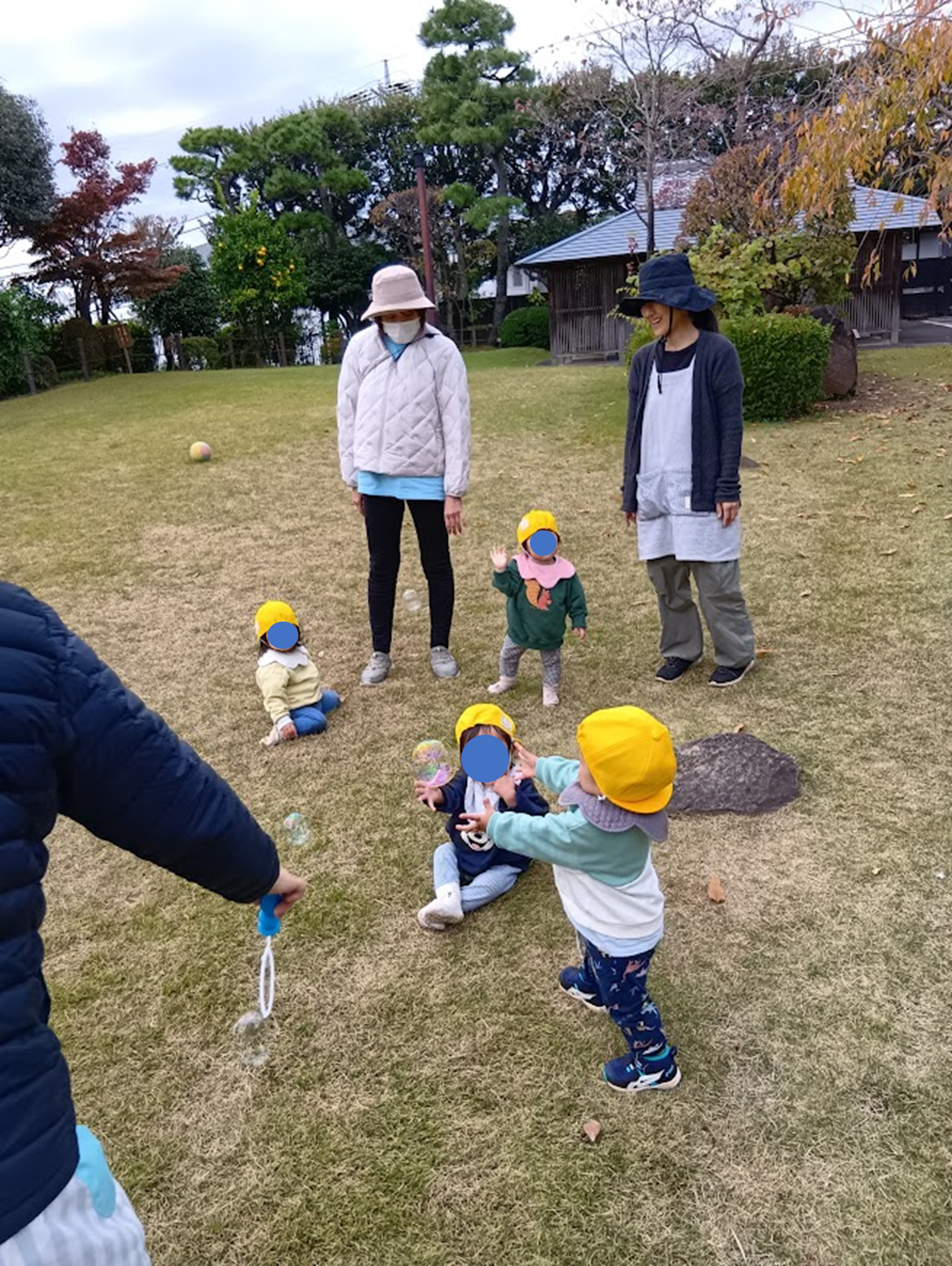 日本庭園でシャボン玉を楽しむひよこさん(0歳児)