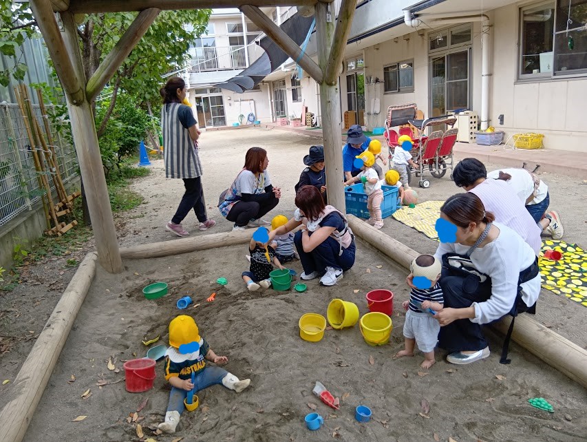 砂場遊びがはじめてのお友だちもいらっしゃいました。お砂場のおもちゃに触れてみて、おもちゃ同士を合わせてカンカン♬